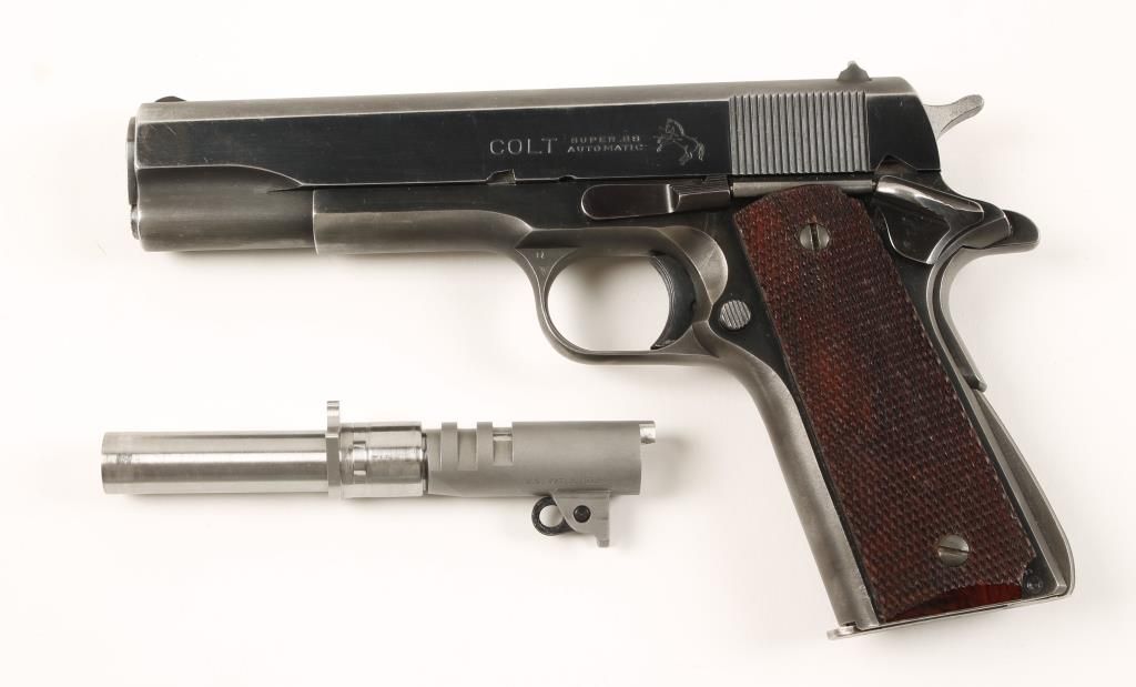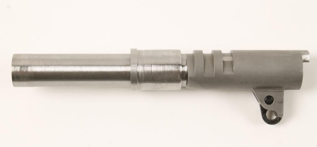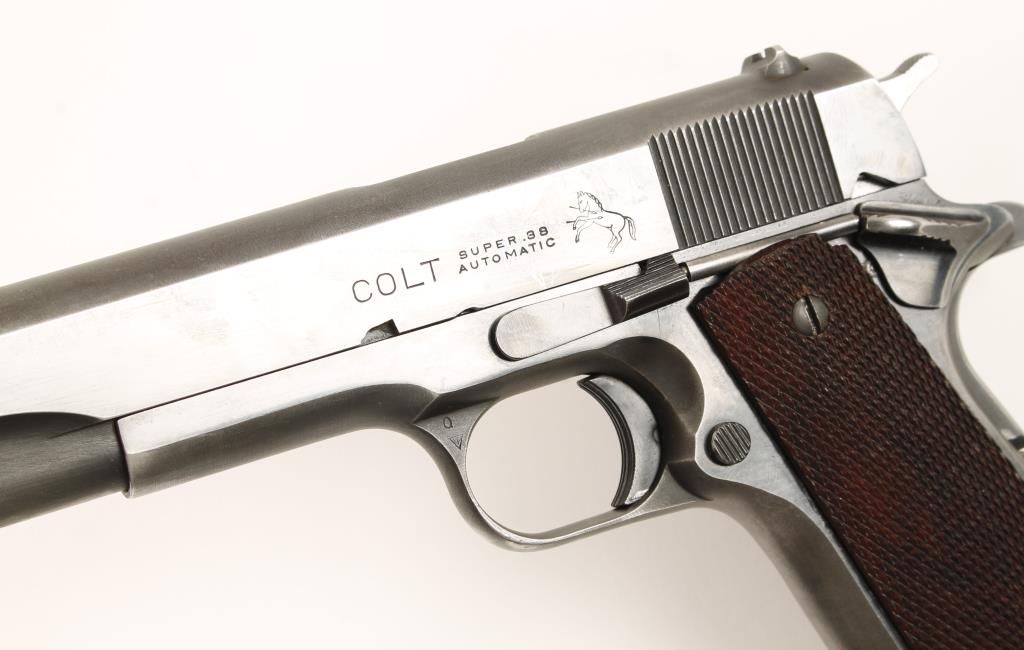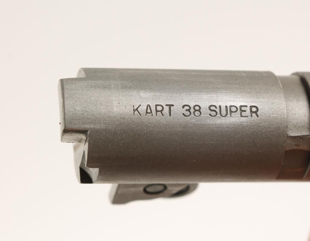 1950 manufactured single action semi-automatic pistol. All steel construction with rosewood grips. Metal finish is excellent with high point and corner edge wear. Grips are fine with sharp checkering. Comes with one factory magazine and a KART barrel/bushing set also in .38 Super. Bore is bright with visible rifling. Condition is very good. *Modern Firearm*