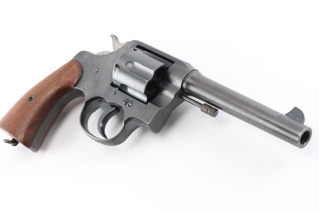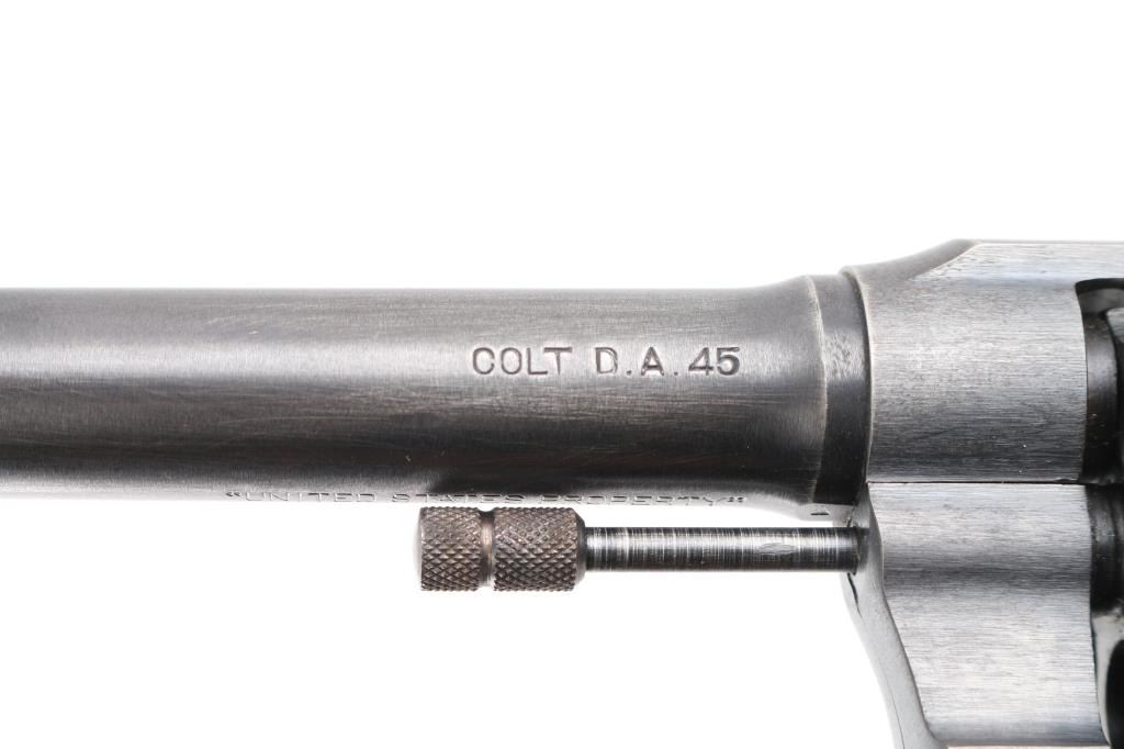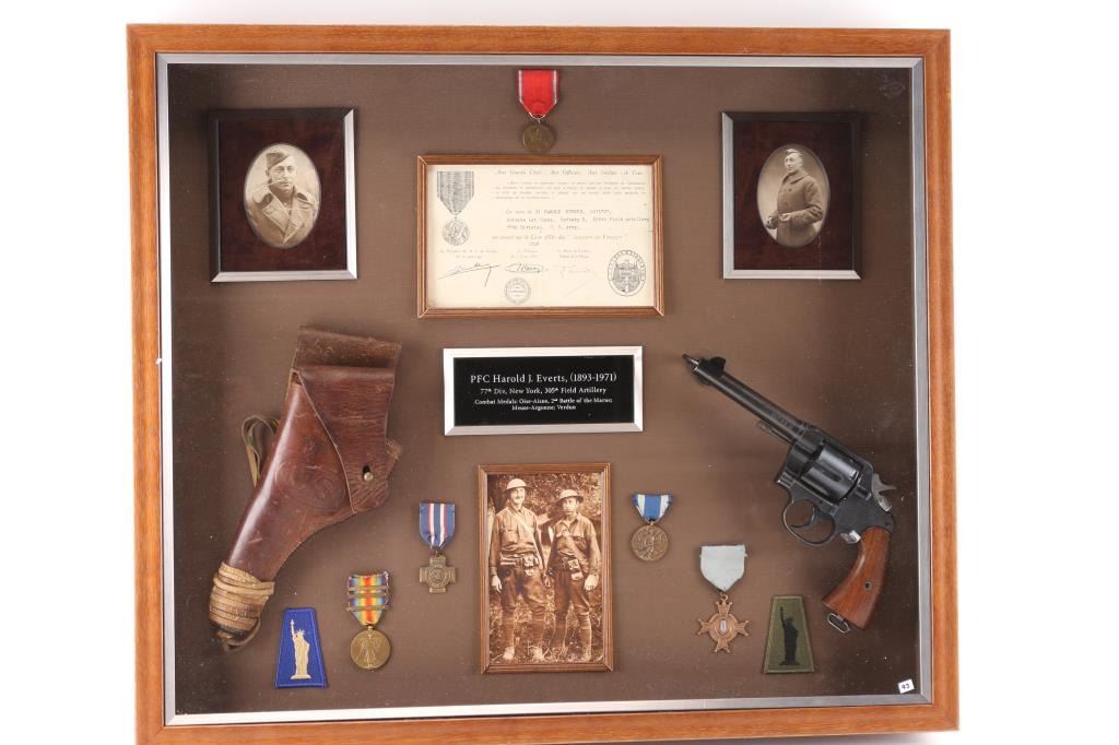Display #1 - Outstanding Colt Model 1917 .45ACP revolver, holster, medals, documents and display honoring PFC Harold J. Everts (1893-1971) who served in Europe with the 77th DIV Field Artillery and received combat medals - OISE, AISNE, 2nd Battle of Marne. Muese-Argonne and Verdun. Alos, his patches and photos. Display #2 - Has honorable discharge, dated May 10, 1919 and service certificate. Display #3 - Notebook containing many photos of Everts and family, military photos with inscriptions, copies of related military service records and original note from CPT W. Brackett denoting Evert's rejection from Marine Corps due to physical reasons. Interestingly he appeared as Von Flamborg in the Ziegfeld Follies and his wife was "the midnight girl". Everts wasn't injured during service by "gas attack". Model 1917 Colt .45ACP #65857 (number on butt) remains in original fine to near mint condition. 97% original military dull blue finish remains with only light holster wear observed. Only operation of action and marks on back of hammer from display (very minor). Bright original polish on hammer sides, bright bore, excellent markings, no drag line on cylinder. Grips show minor storage marks, but fine to excellent overall. Not quite mint, but very, very close. Rated 9.9 on 1-10 scale. Holster G&K MFG dated 1917 in good condition showing wear and use in the field. Included is the history of New York 305 Field Artillery. One dated. Shows Everts wearing holster w/ this revolver. Worthy of advanced collection or museum display.