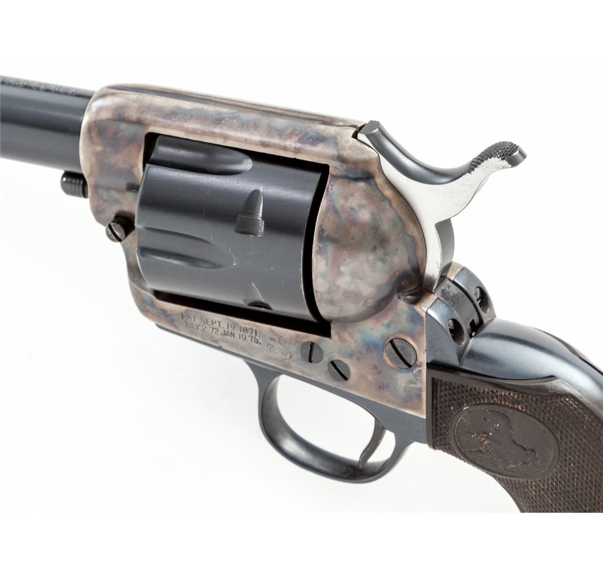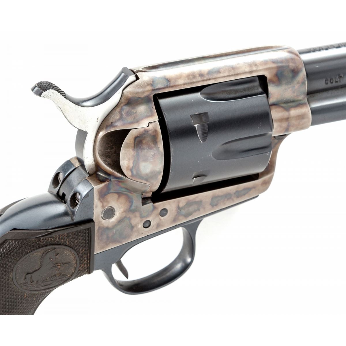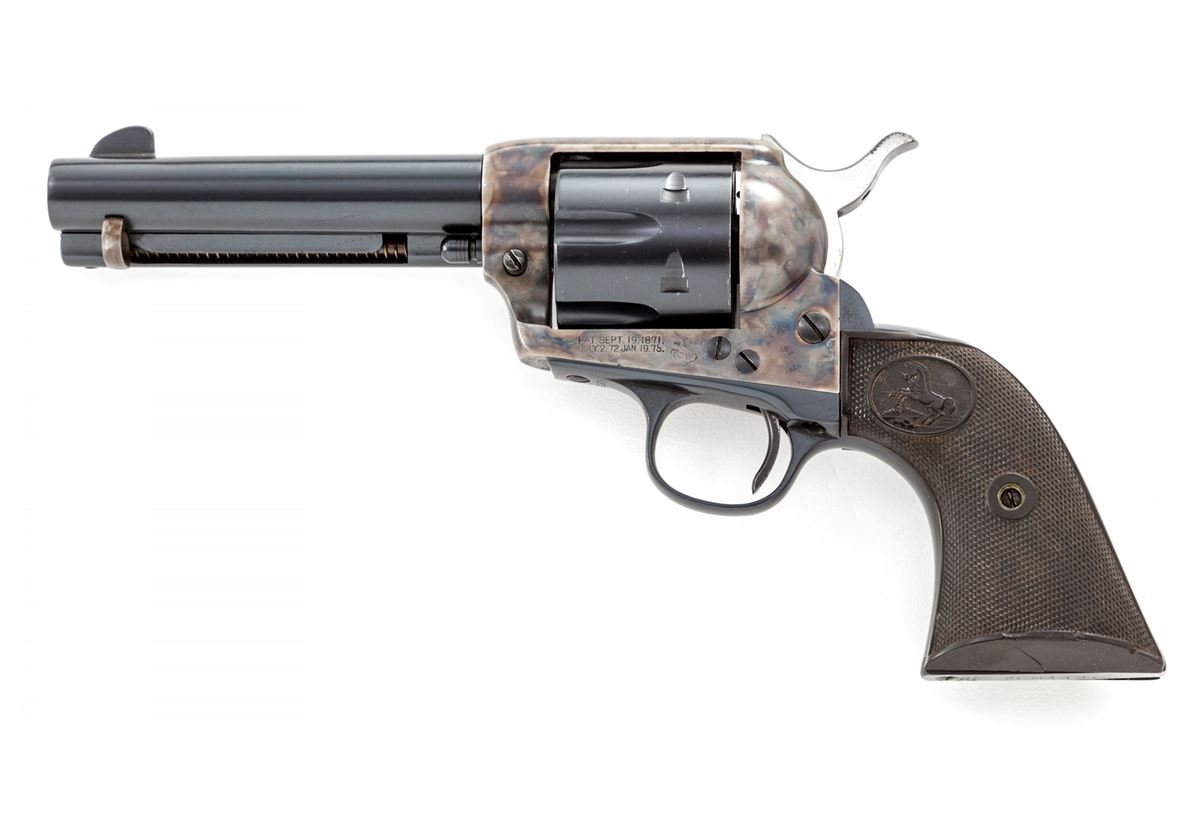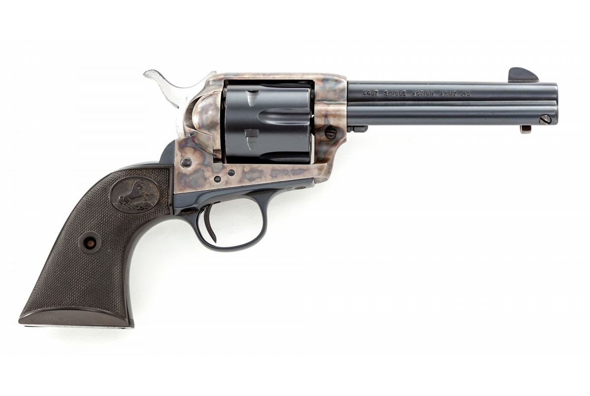 Colt 1st Generation Single Action Army Revolver, #253970, .45 Colt cal., 4-3/4'' barrel, blue and case hardened finish, factory checkered hard rubber grips. Mfg'd 1902. Condition is excellent with factory replaced cylinder and barrel. Caliber markings are on right side. Backstrap and triggerguard have been nicely refinished, but with previous owner's name ''J. Mann'' stamped to bottom of butt. Case hardened frame appears original and retains approx. 92% vivid original colors. Hammer, trigger and bolt stop screw appear to be later replacements; original case hardened hammer has been replaced with a post-war Colt variant. Grips remain crisp with small losses to left butt edge side border. Action is crisp and tight, bore is excellent. Est.: $1,200-$1,800. (C&R/PPT)