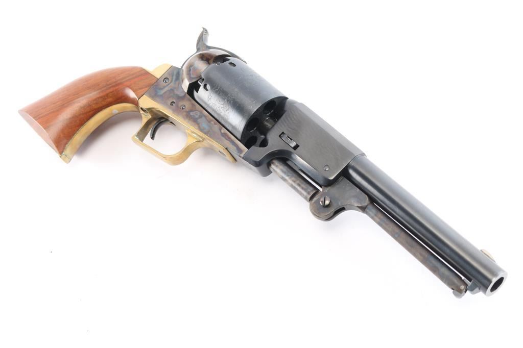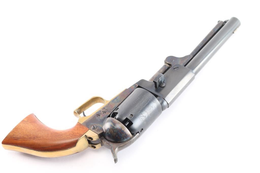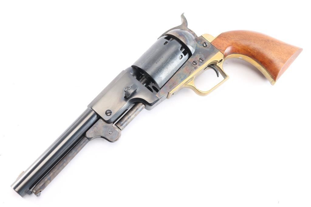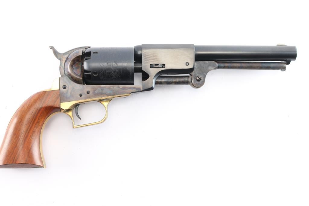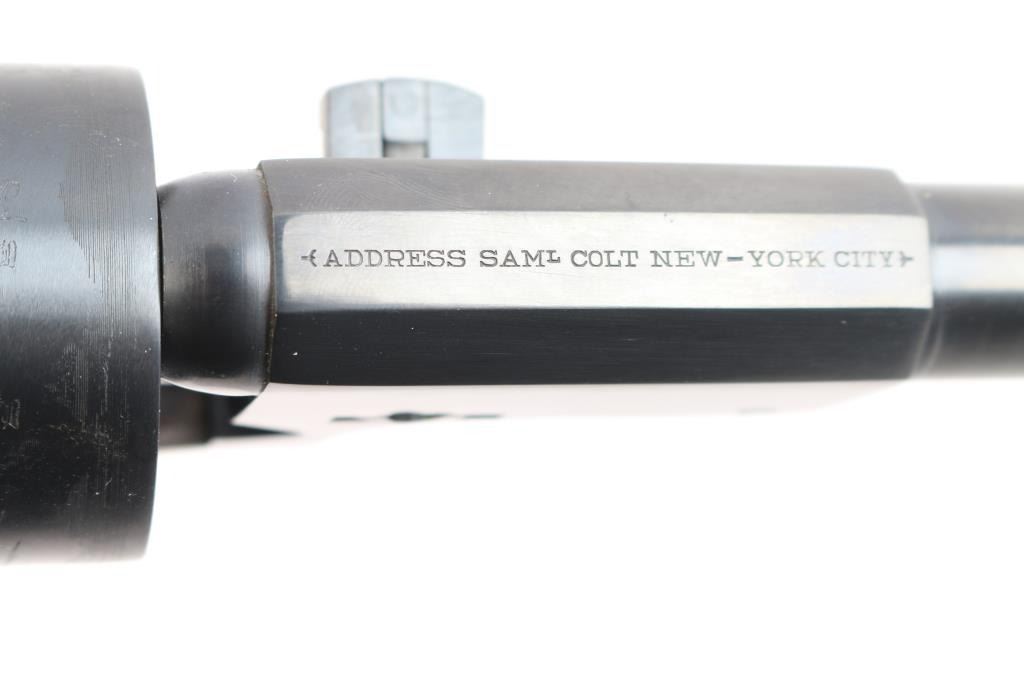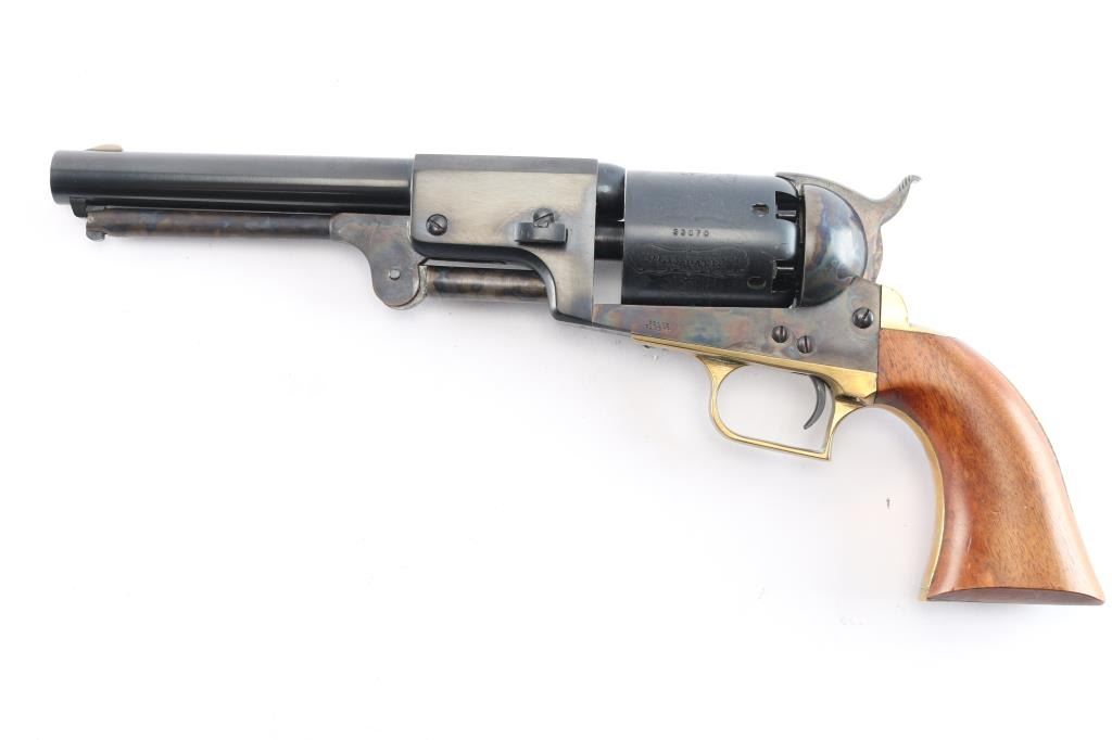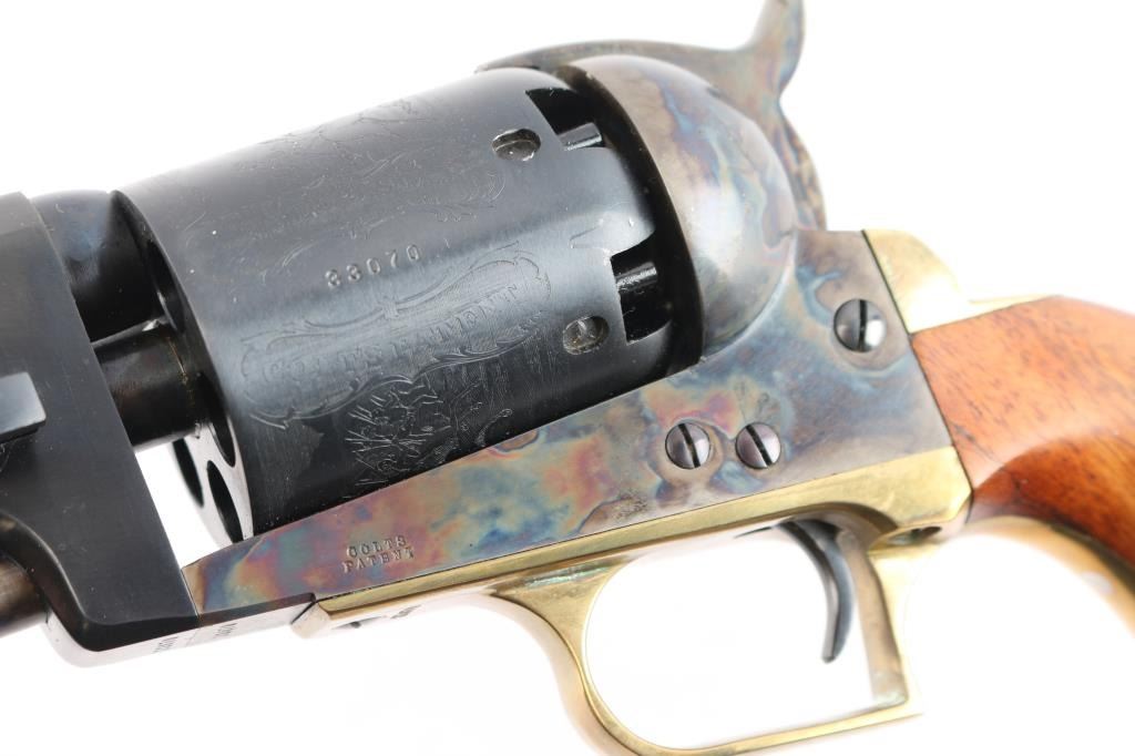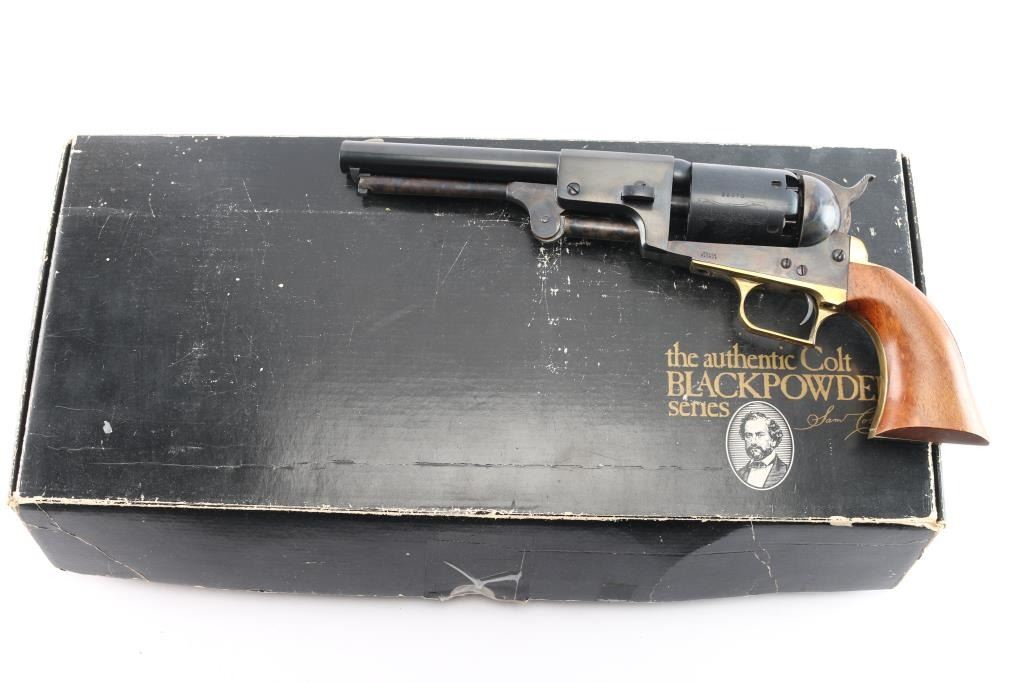 'The Authentic Colt Black Powder Series' brings a finely crafted 2nd generation reproduction of the 1st Model Dragoon .44 caliber percussion revolver. It features a 7 1/2" half octagonal barrel, a blade front sight, notched rear sight in hammer, checkered hammer spur, smooth curved trigger, smooth walnut single piece grips, and a square back trigger guard. The unfluted 6 shot cylinder is roll stamped with a battle scene, and oval stops have been machined into it. There are matching serial numbers on the barrel, frame, trigger guard, cylinder, and backstrap. The barrel, cylinder, and trigger have a blued finish with approximately 98% remaining showing a couple of small scratches on the cylinder, and one scratch on the edge of the barrel by the serial number. The bore, rifling, and cylinder are in excellent condition. The action is smooth and crisp. The color-case hardened frame, loading lever, and hammer are all beautifully finished with only superficial scratches on the loading lever. The brass triggerguard and backstrap are excellent showing tarnished areas in the corners/edges of the triggerguard, and at the top of the grip by the hammer. This firearm includes original factory black cardboard box with documents.