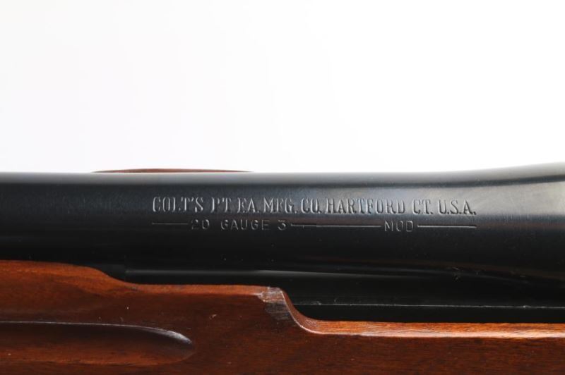 Shot-Gun. Pump-Action. Aluminum receiver manufactured by Manul France, with other parts sourced in the U.S., assembled by Jefferson Manufacturing Co., later called Kodiak, and Montgomery Ward 1961-1965. Around 2,000 made. Barrel stamped " Colt's PT FA Mfg. Co. Hartford Ct. U.S.A. 20 Gauge 3-Mod- " in two lines. Bottom of receiver stamped "Action", "Made in France" over serial number. Gold toned "Rampant Colt" with "Colt" medallion on underside of forearm. Smooth walnut Stock and forearm are very good, but there is loss to the finish where the stock meets the buttplate. Black plastic lined buttplate with "Rampant Colt", and "Colt". Bore appears excellent/bright. MOD choke. Action is crisp/tight. Black painted receiver is very good with some handling loss on the triggerguard. Blued barrel is about 98% with a rub on the top, and some very minor scratches. Rare 20 ga. One of these sold at auction in 2017 for over $1,000.00. NRA Condition-Very good. C& R Firearm.