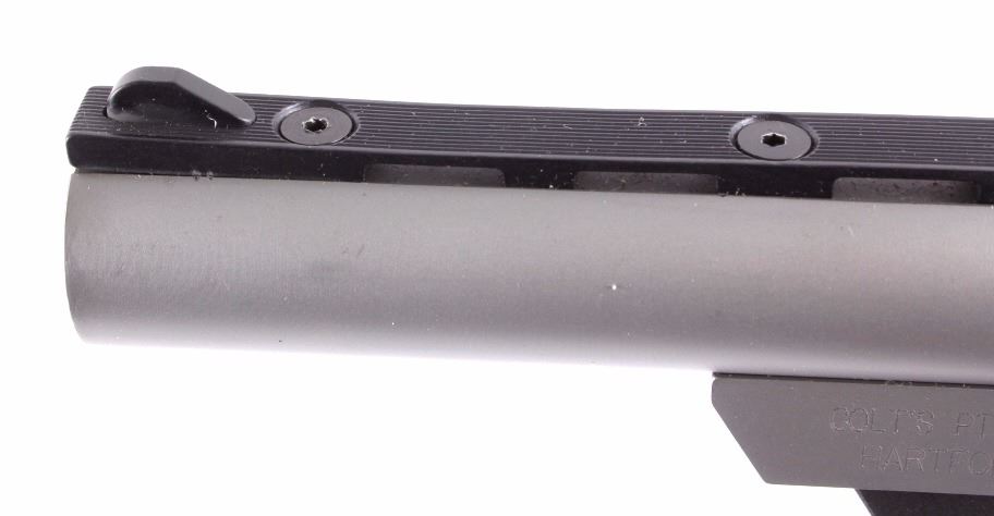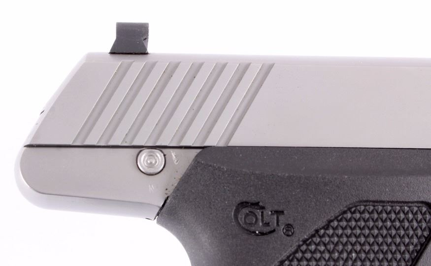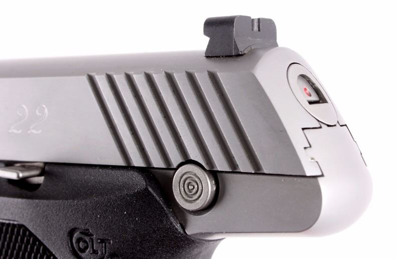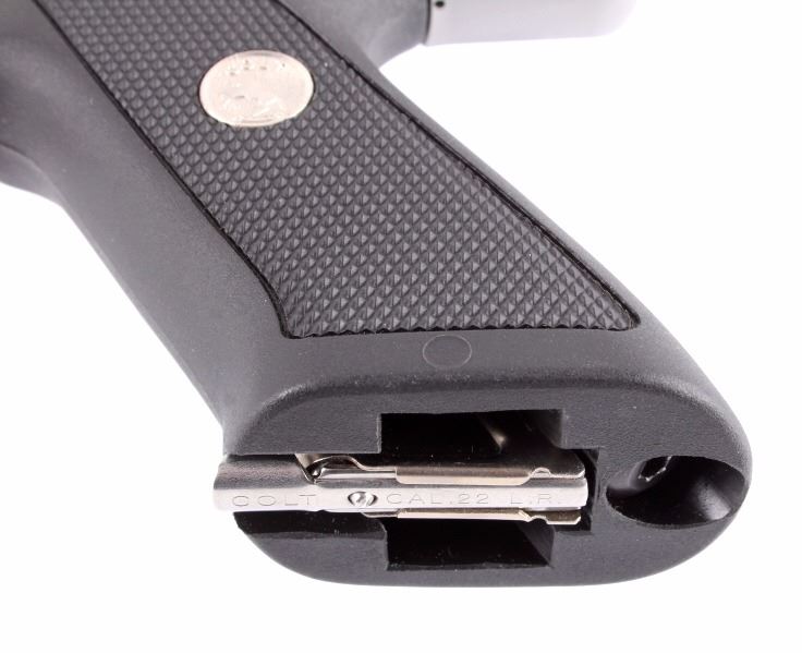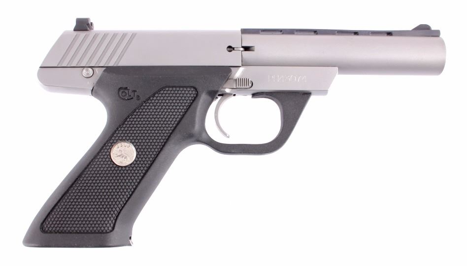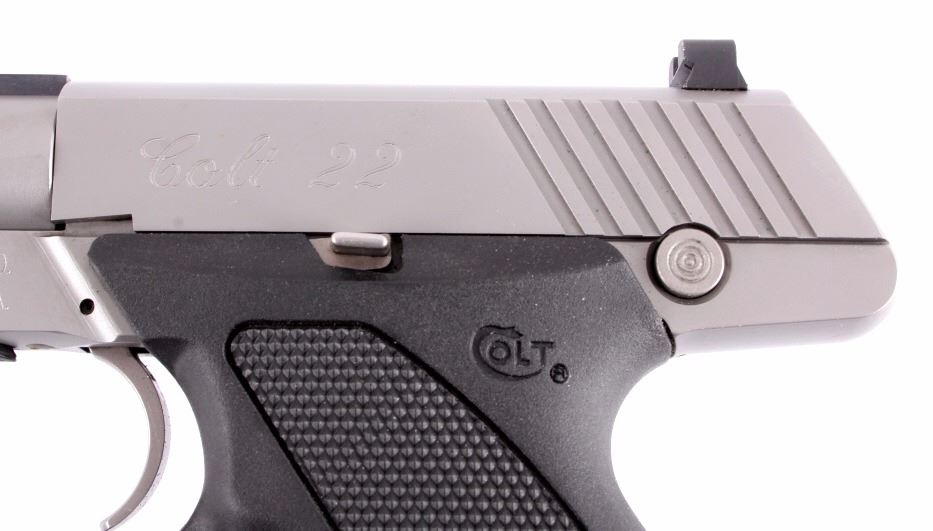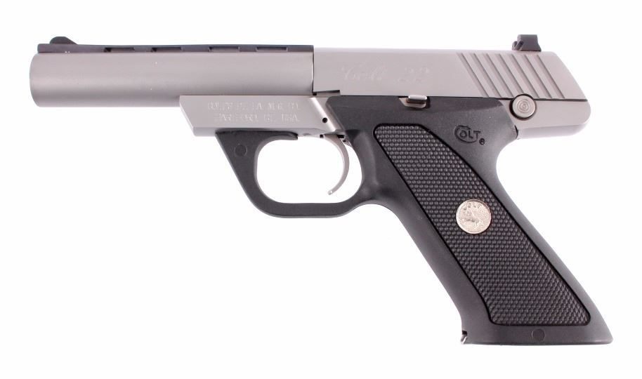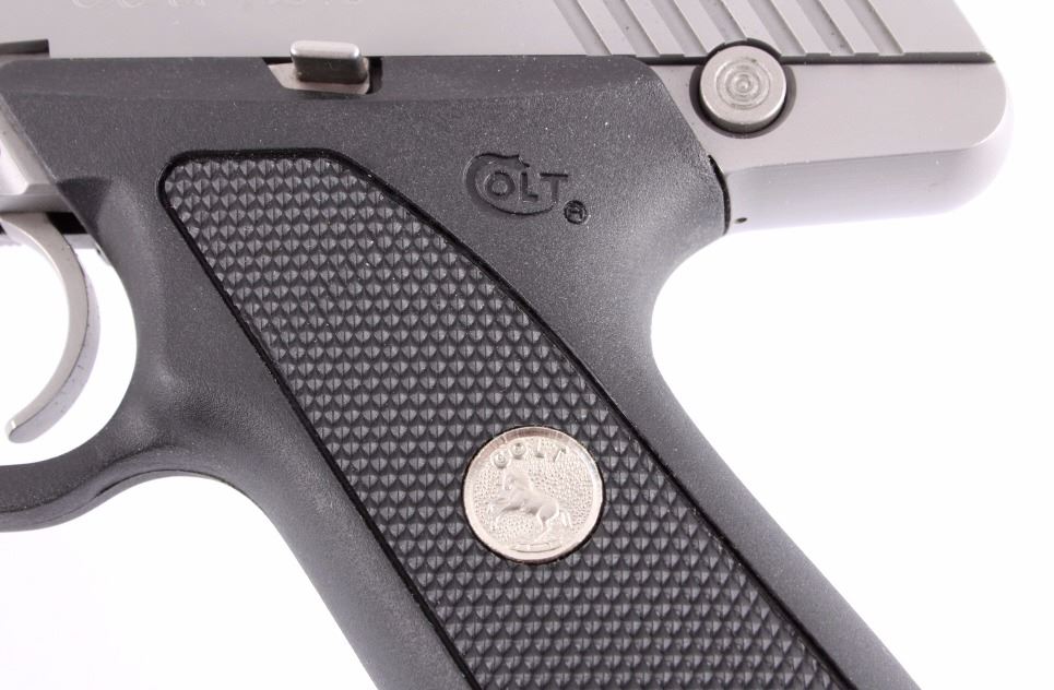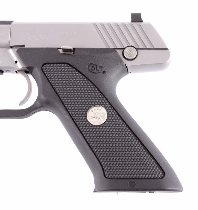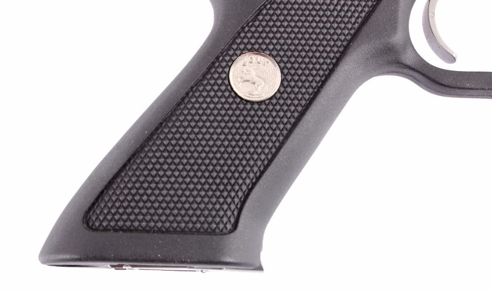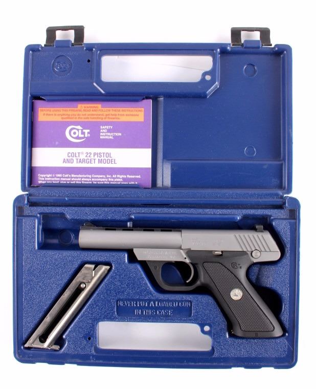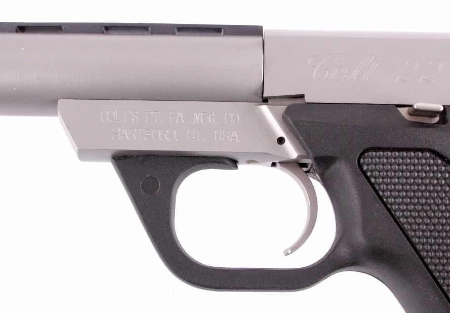 This is a Colt 22 Target Model semi-automatic pistol chambered in the .22 Long Rifle caliber. The pistol shows a polymer frame with a steel upper receiver and slide assembly with checkered grips. The slide has rear serrations on both side and is marked "Colt 22". The barrel is marked "22 LR" and above the trigger guard the reciever is marked "Colt's Pt. F.A. Mfg. Co. Hartford, Conn. USA". The pistol comes with the original box, two magazines and the instruction manual. The Colt 22 Target Model pistol is in very good condition. It measures 4.75" x 8.75". Serial number is PH43074. This is a modern manufactured handgun and requires NICS background check or FFL transfer.