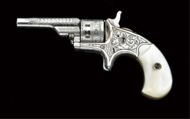 Colt .22 caliber 7-shot Opentop or Old Line revolver, period scroll engraved, nickel plated, pearl grips, serial #22536. The pistol shows 60-80% original nickel which shows some lifting and polishing. The front sight is missing, the address is good, the grips are very good. The engraving is original to the period and slightly more deluxe than normal with a nice treatment on the cylinder. From the Howard “Bud” Goebel collection. Est: $600 - $1,200