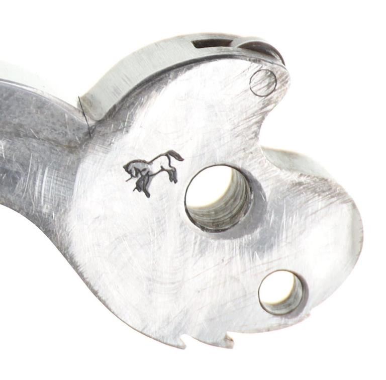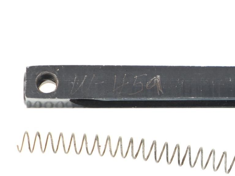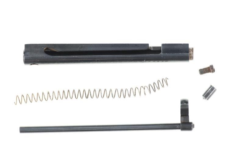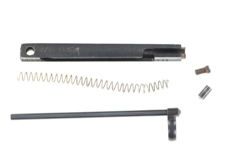 The lot features a total of eight original factory Colt parts for the Single Action Army Model 1873 from the second generation to third generation circa 1956-1982. The lot includes two hammers, a cylinder, ejector tube, ejector, ejector spring, screw and stud. All of these are Colt parts for the Single Action Army Peacemaker revolver. One hammer has a rampant Colt stamped into it. This example has what appears to be a rounded hammer with tight knurling. The cylinder has deep blue original blue color and is for a .45 Colt caliber. The ejector tube, ejector and two screws / stud are all original blue finish as well. A nice collection ranging from the 2nd to 3rd generations of the famed SAA revovler. Ejector tube is 4-inches long, ejector is 4 3/16-inches long, spring is 3 5/8"-inches long, hammers are 2 5/8-inches long and the cylinder is 1.75-inches long by 1 5/8-inches diameter.