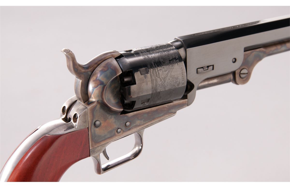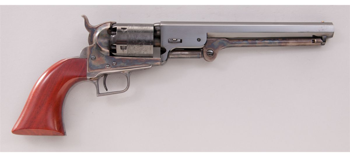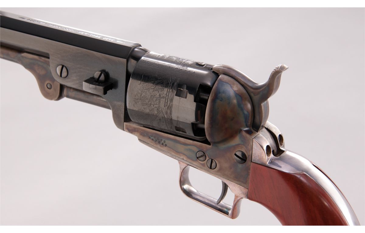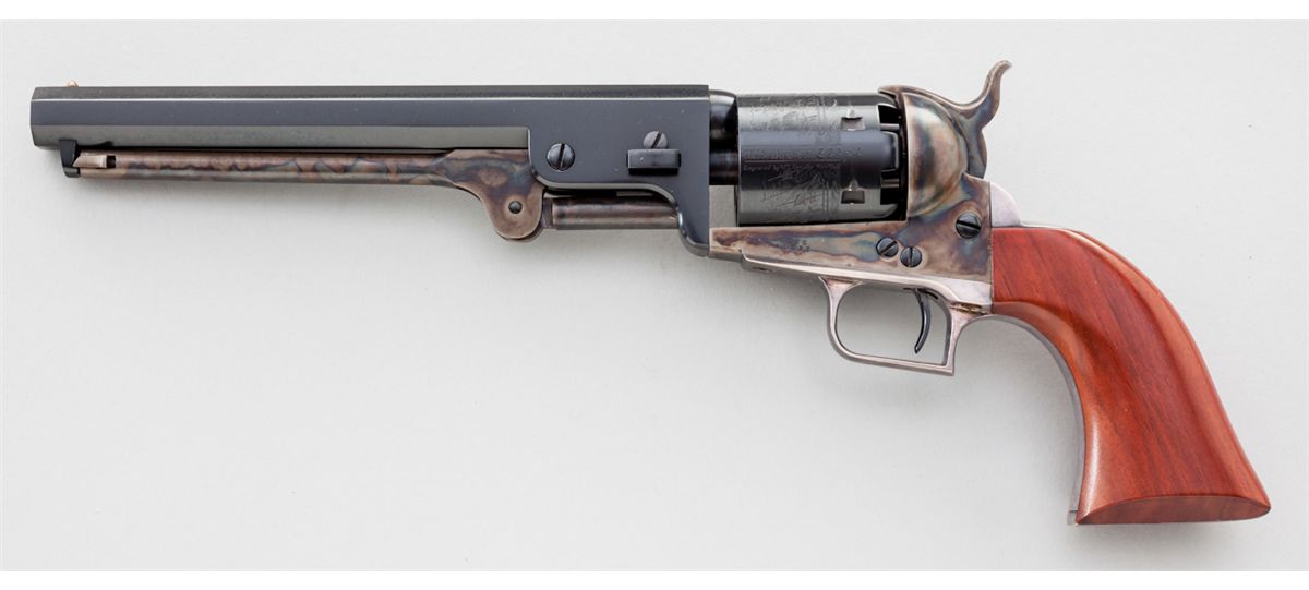 Colt 2nd Generation Model 1851 Navy Revolver, #23753, .36 cal., 7-1/2'' octagon barrel, blue and case hardened finish, with one-piece varnished hardwood grips. This is the desirable variation made from 1969 to approx. 1982 and uses a continuation of the original serial numbers. Revolver features silver-plated squareback triggerguard and backstrap. Condition is excellent, appearing near new and unfired, with only light marks from handling, including very faint dragline. In partial original box missing half of styrofoam insert. Simulated woodgrain slip case with tatters and end label losses. Est.: $450-$650.