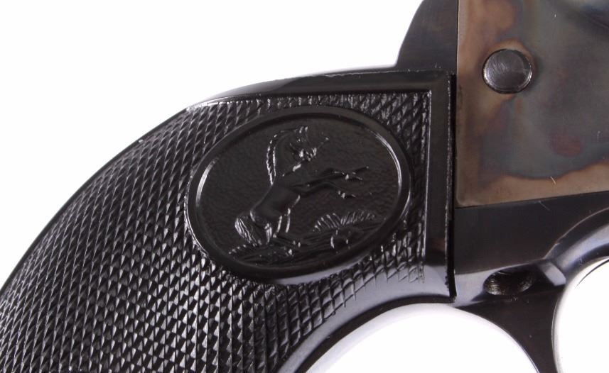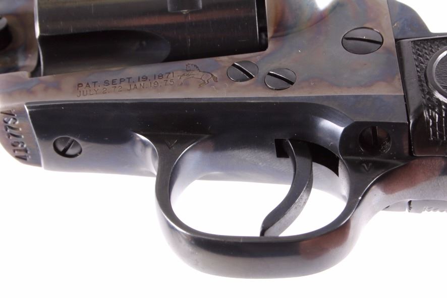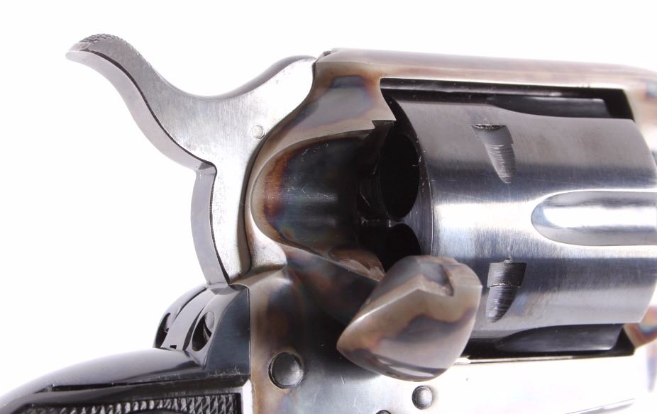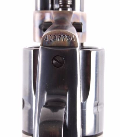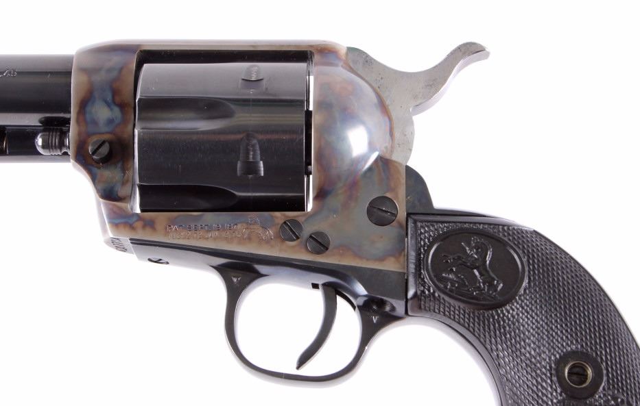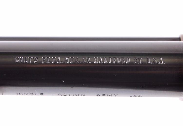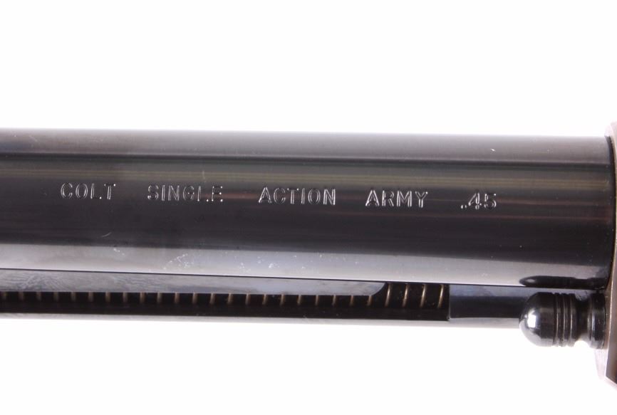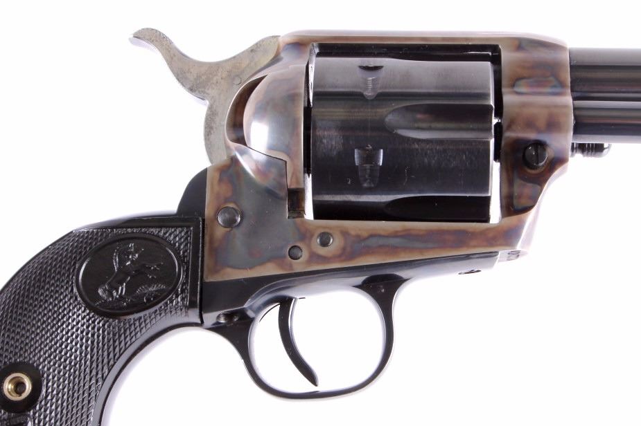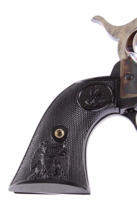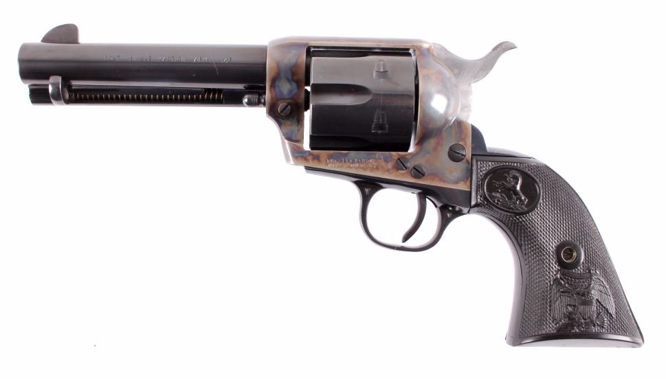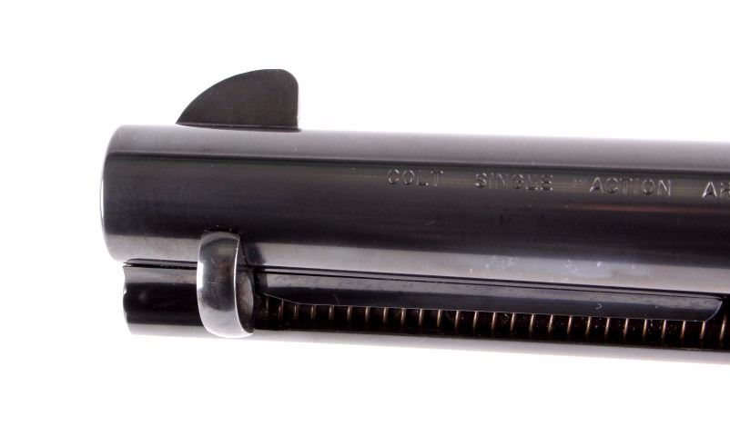 This is an exceptional 2nd generation Colt Single Action Army (SAA) revolver chambered in the .45 caliber and manufactured in 1966. The pistol features a case hardened frame with a 4.75" blued barrel, trigger guard and grip frame. The checkered grips show the Rampant Colt emblem at the top with the Army Eagle emblem with shield, arrows and olive branch at the bottom along with the motto "E. Pluribus Unum". The Colt Single Action Army revolver is in very good condition with little to no wear. Serial number is 41977SA and was manufactured in 1966. This handgun requires Curio & Relic FFL, FFL or NICS background check for transfer. The revolver measures 10.25" with a 4.75" barrel.