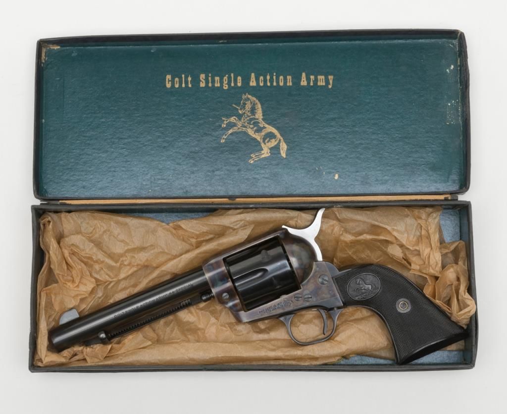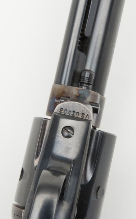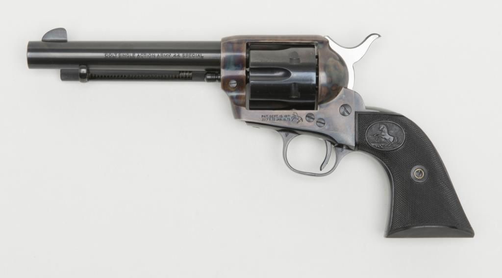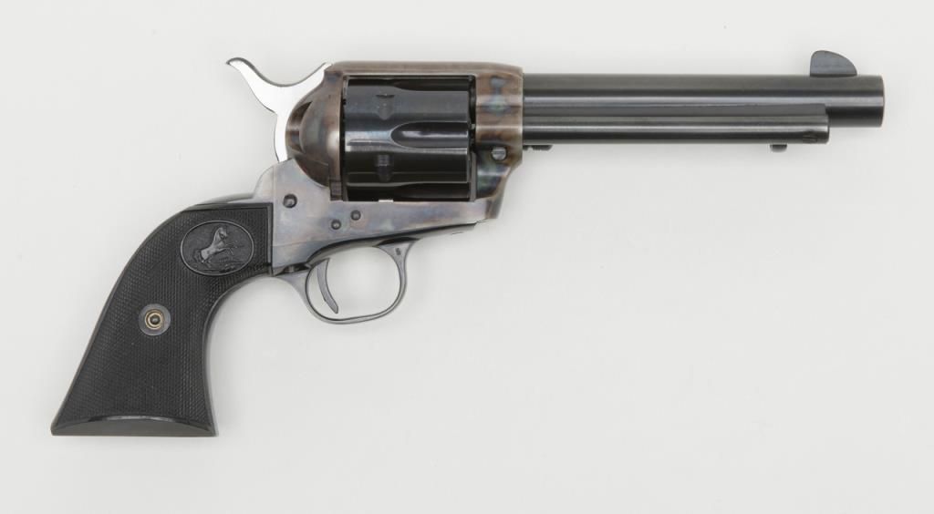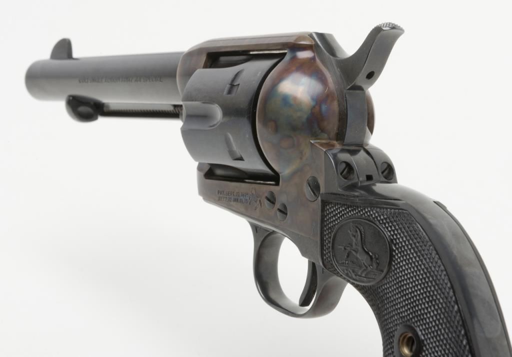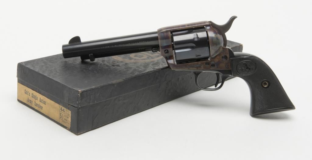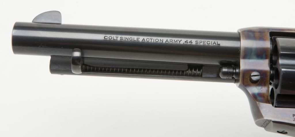 Colt 2nd Generation SAA revolver, .44 Special cal., 5-1/2” barrel, blue and case hardened finish, checkered hard rubber grips, #20410SA in overall like new condition showing little handling; in factory black box with instructionsand very good box with correct gold end label. (C&R/PPT). Est.: $1,500-$3,000.