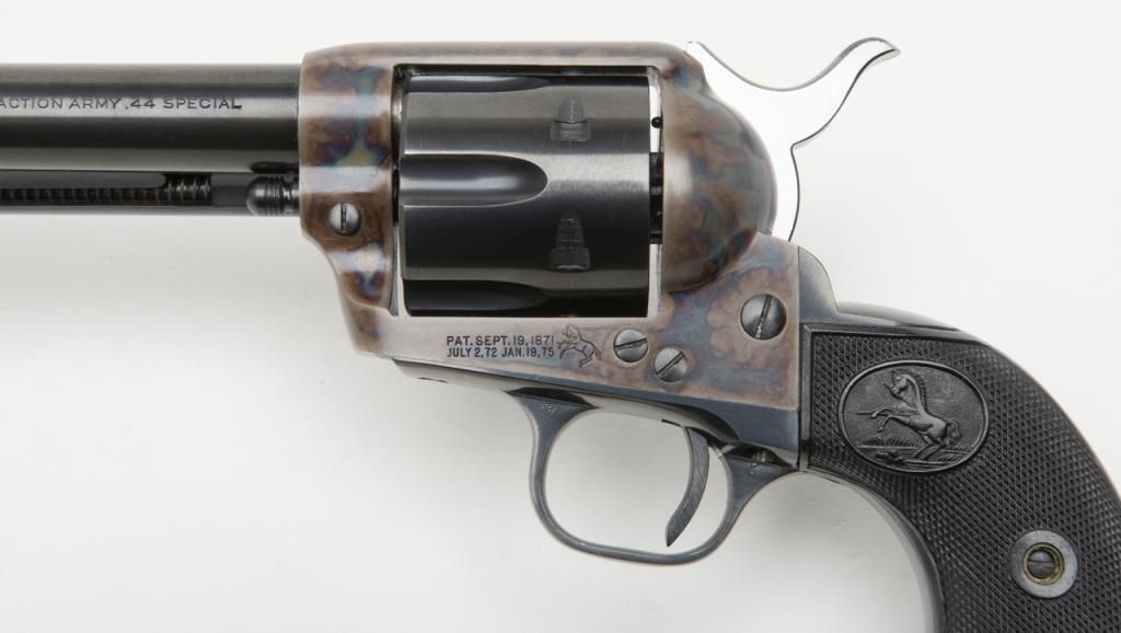 Colt 2nd Generation SAA revolver, .44 Special cal., 7-1/2” barrel, blue and case hardened finish, checkered hard rubber grips, #23217SA in overall like new condition showing little handling; in factory black box with instructionsand cleaning brush; box is overall good with some tape repairs; correct gold end label. (C&R/PPT). Est.: $1,500-$3,000.