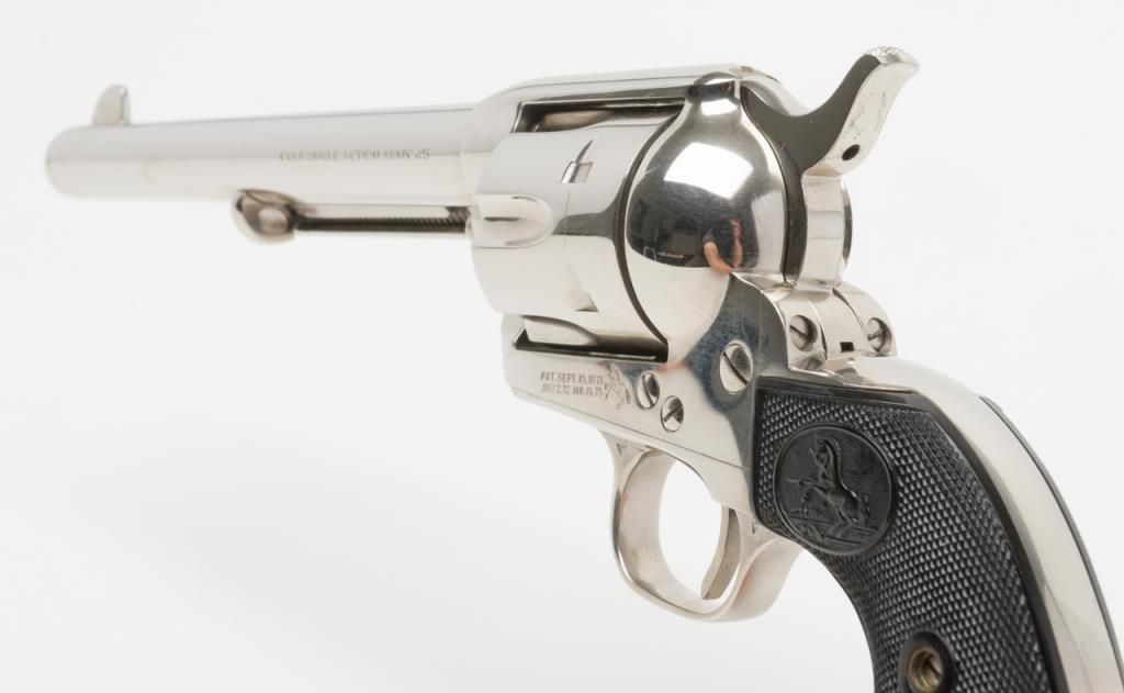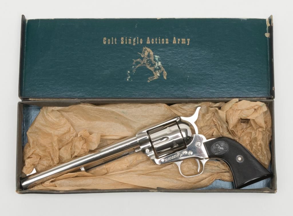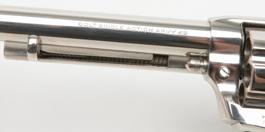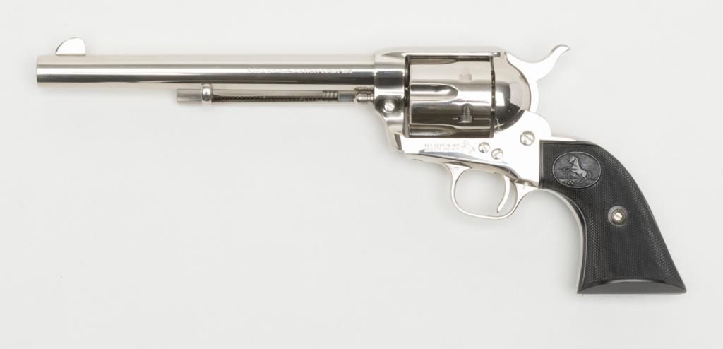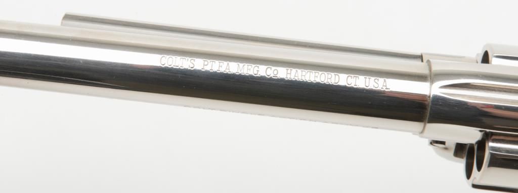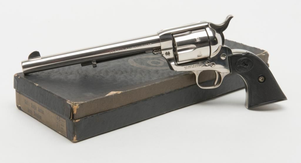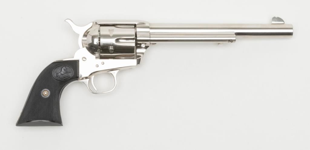 Colt 2nd Generation SAA revolver, .45 cal., 7-1/2” barrel, nickel finish, checkered hard rubber grips, #27263SA in overall like new condition showing little handling; in factory black box with instructions; box is in overall fair to goodcondition with some scuffing and lid is missing front panel; correct gold end label. (C&R/PPT). Est.: $1,500-$3,000.