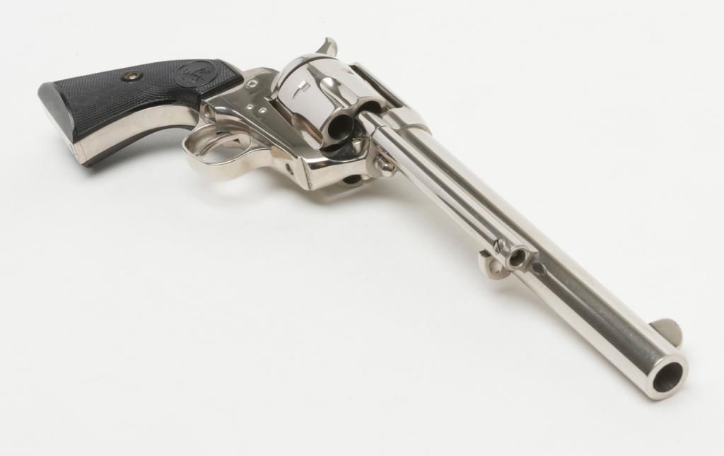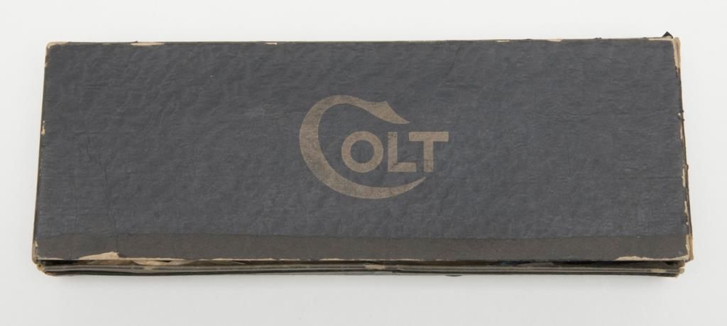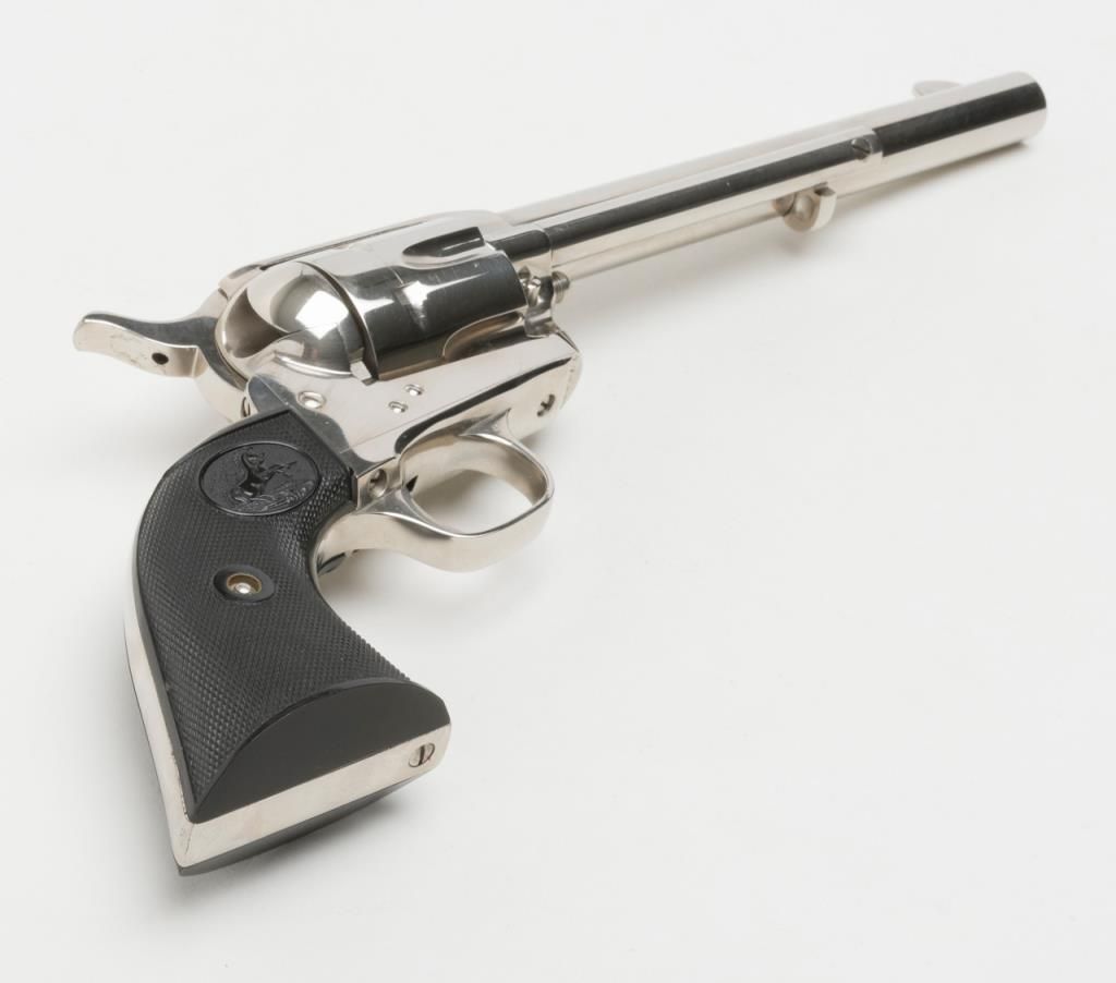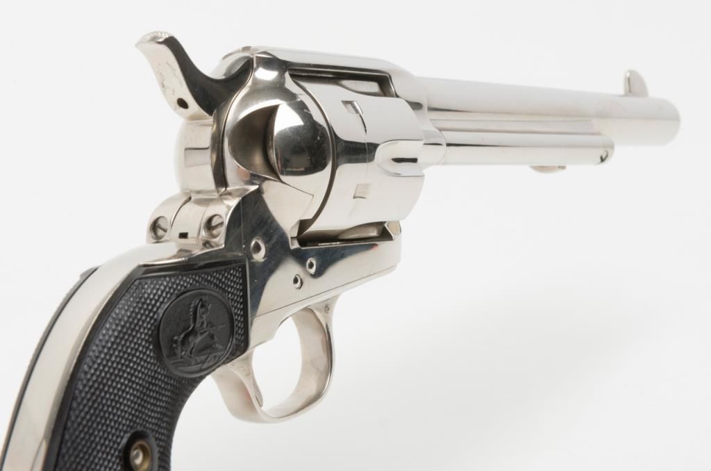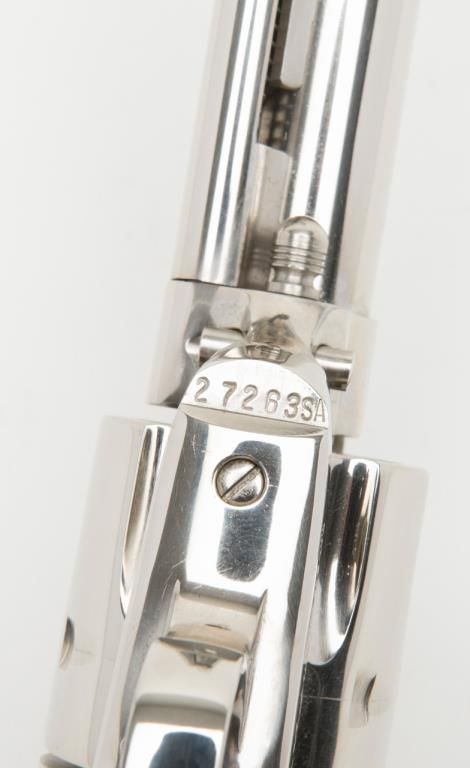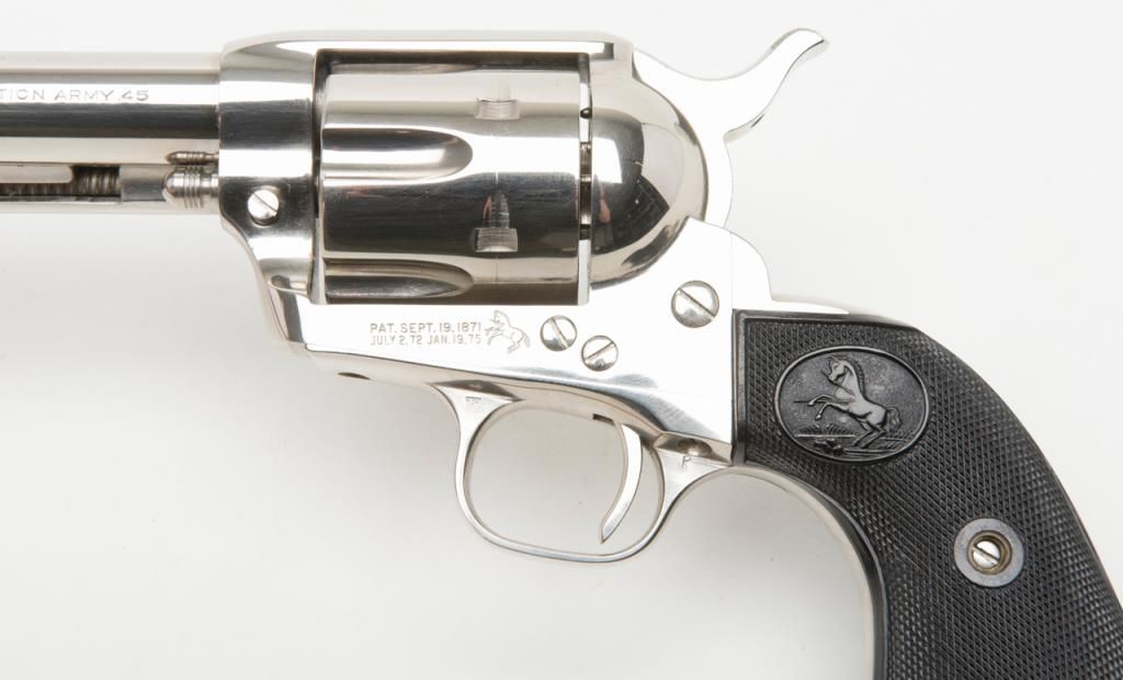 Colt 2nd Generation SAA revolver, .45 cal., 7-1/2” barrel, nickel finish, checkered hard rubber grips, #27263SA in overall like new condition showing little handling; in factory black box with instructions; box is in overall fair to goodcondition with some scuffing and lid is missing front panel; correct gold end label. (C&R/PPT). Est.: $1,500-$3,000.