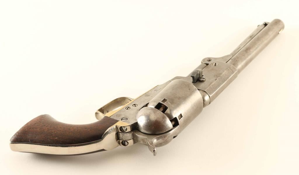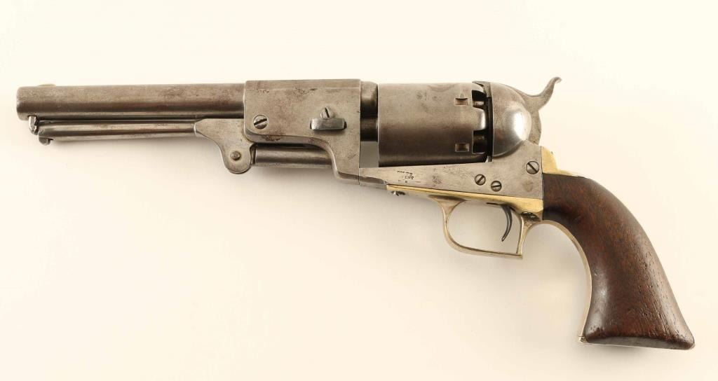 Early "U.S." marked single action percussion revolver chambered for .44 caliber ammunition, manufactured circa 1850(first year production). Colt Second Model Dragoons are significantly scarcer than the First and Third Models with the approximate production numbers as follows: 2,700 2nd Mdl, 7,000 1st Mdl & 10,500 3rd Model. This revolver features a 7 1/2" part octagon barrel, German silver blade front sight, 'v' notch rear sight cut into the hammer, loading lever with vertical style latch, non-fluted six-shot cylinder with rectangular stops & no observed scene, smooth trigger, non-roller bearing hammer with smooth spur, plated brass backstrap & square back trigger guard, and one-piece smooth walnut grip. The barrel is stamped "-ADRESS SAMl COLT NEW-YORK CITY" on the top reading towards the cylinder and the frame reads "COLT'S/ ATENT/U S." The serial number 8109 is found on the frame, triggerguard, backstrap & cylinder pin, while the the partial number 109 is found on the loading lever and cylinder. Other observed markings are "G" on the triggerguard below the serial number and "9" on the loading lever latch. Revolver appear to have been heavily cleaned at some point with the majority of the iron surfaces displaying a smooth light grey patina with some mottled brown tones. The brass grip frame appear to have been replated with approximately 70% intact. The barrel wedge and loading lever catch are modern replacements. The action is slightly out of time but otherwise in functional, the bore shows strong rifling with some scattered pin prick pitting, markings are mostly legible and the wood grip is very good with worn edges at the butt. Condition is NRA Good. ***Antique Firearm***