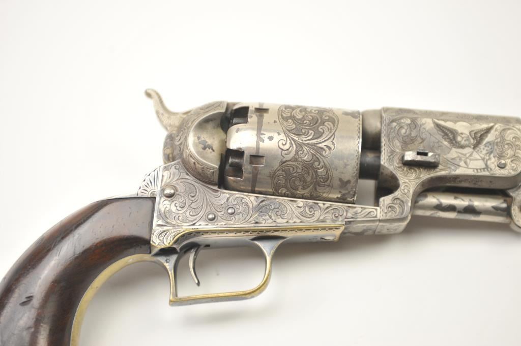 Colt 2nd Model Dragoon Percussion revolver in .44 caliber inscribed Tribute to Texas Hero, Col. Jack Hayes:, S/N 9343. Fully engraved in Nimschke style with portrait of Hayes on the left barrel lug and inscribed in script“Defender of Texas” and presented to “Col. John C. Hays compliment of Sam’L Colt Nov. 29 1849”. This revolver is silver plated with burl wood grips carved on bottoms “C. Taylor” on bottom left and T (Texas star between)and R. The right barrel lug is engraved with a fine eagle with spread wings in stand of arms with “Lone star” flags and American flag beneath. About 80%-90% silver showing aging. This Colt was engraved approximately 50-60years ago and has a long history known to Colt collectors and sold for over $100,000 to a prominent old time Colt collector before identified as a later than the period work of engraving. To produce a gun this well attoday’s cost we would estimate at $15,000-$25,000. An impressive and 1 of a kind colt “Tribute”. (Antique) Est.: $7,500-$15,000+