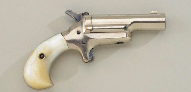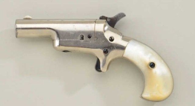 Colt #3 .41 caliber rimfire derringer 5th variation, nickel plated with factory pearl grips and British proofs. Serial #4563. The derringer remains in fine to near excellent original condition retaining 95%-98% nickelwith just slight losses at muzzle and edges. There is some minor scratches but markings and metal surfaces are crisp. The screws and small parts show original fire blue and the hammer retains most of its bright casehardening. The grips are near fine with beautiful colors. The breech end of the barrel shows a couple of nicks from improper closing with the hammer down. The breech is tight, the bore is fairly bright. A highcondition original #3. Est.; $1,750-$3,500