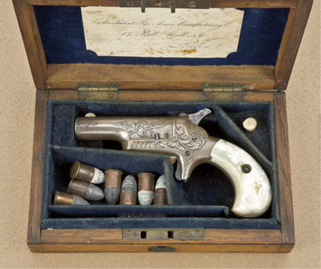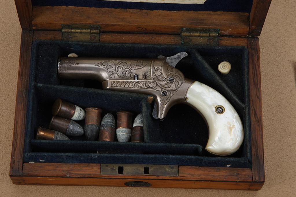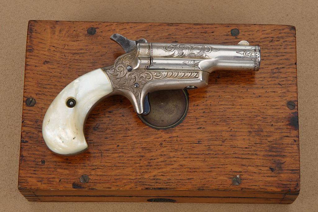 Colt #3 .41 caliber rimfire derringer, finely period scroll engraved in Nimschke style, silver plated, pearl grips, British proofed, serial #39138. In original partition style case with oak exterior and Colt London Agency label in lid. The derringer shows 75-85% original darkened silver finish that is completely uncleaned, just some beginning normal age, miniscule amount of bubbling, and some slight pitting on the hammer whichshows considerable original case hardening. The grips fit impeccably and are very thick. The engraving is absolutely original to the period and there are no nicks on the back of the barrel from improper closing. The barreladdress is sharp, the grips very good plus. The interior of the case is very good plus with some slight fraying, normal aging, minor discoloration, and original compartment cover is retained. The label is fully intactand just slightly oil stained. The exterior of the case is good to very good, missing its brass key plate, but brass owner’s plate and brass screws are retained. An absolutely untouched rig from an old eastern collection