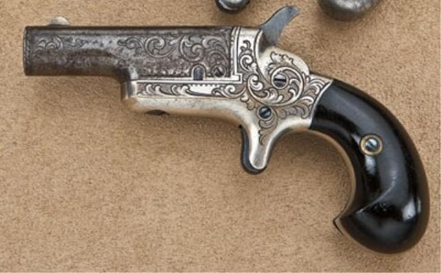 Colt #3 derringer .41 caliber rimfire transition with standard hammer and curved grip, finely factory style engraved, silver plated, varnish wood grips, serial #25061 with “E” marking beneath the frame. The barrel shows traces of original plate drifted to grey metal with some light to moderate erosion and pinprick pitting and some slightly heavier pitting on the right front sight of muzzle. The frame shows 50-60% original silver drifting at the edges with some slight wear at the high point where the bolt locks the barrel and some slight filing there. The grips are very good with 50-60% varnish. The markings are good, generally good overall. The engraving is definitely to the 19th century and the small parts and screws show considerable original color. From the Howard “Bud” Goebel collection. Est: $1,500 - $3,000