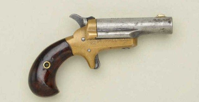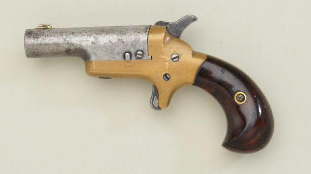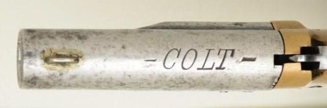 Colt #3 derringer in .41 rimfire caliber 5th variation with Pall Mall markings on right side of frame and British proofs. Serial #37916. The Colt remains in good to very good condition with a light patina on barrelshowing faint traces of blue where protected. There is some light erosion and pinprick pitting. The frame shows an even patina and the grips are very good. Also there is a rampant Colt stamp by the address on theright side of the frame. The hammer shows some case hardening and the bore is fair. There are some minor marks on the breech end of the barrel from improper closing with the hammer down. Est.; $725-$1,450