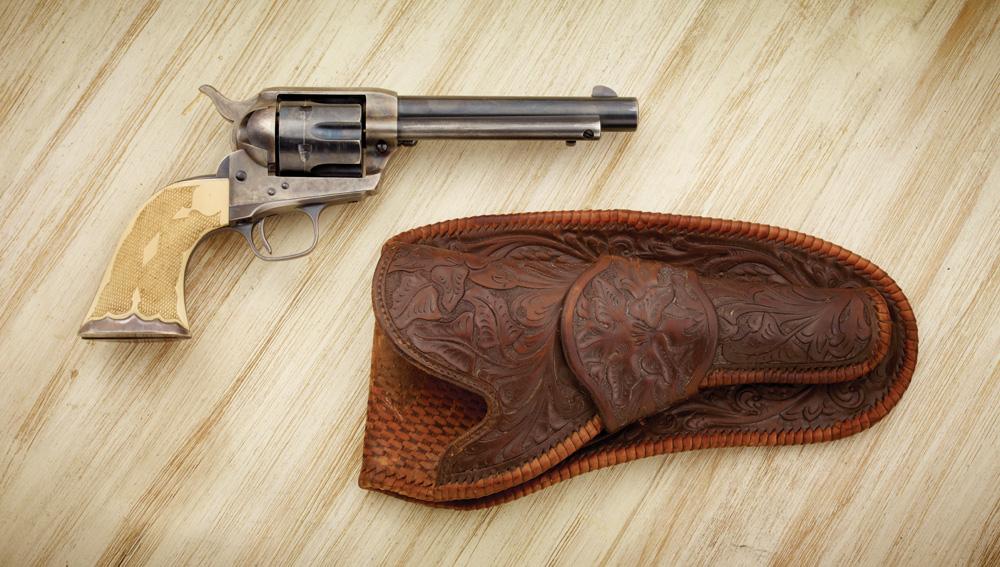 Ser #344847, checkered ivory grips with sterling caps. 90% original case colors, 80% blue remaining. Shows some carry wear. Comes with nice circa 1930s tooled single loop holster