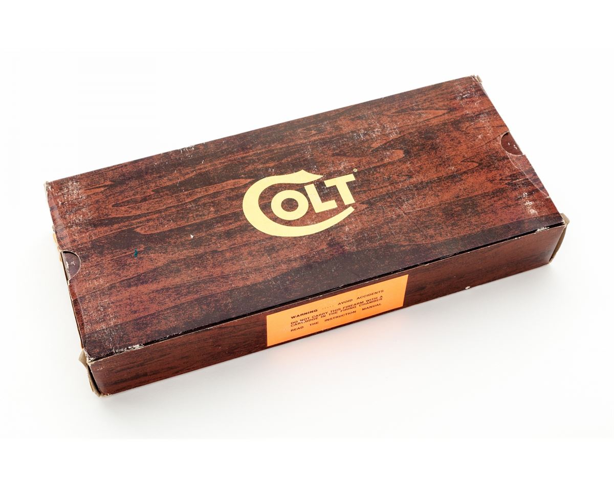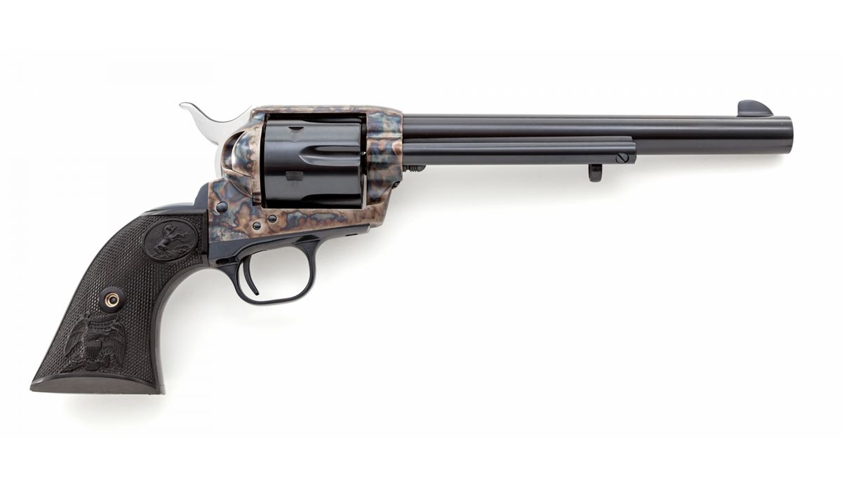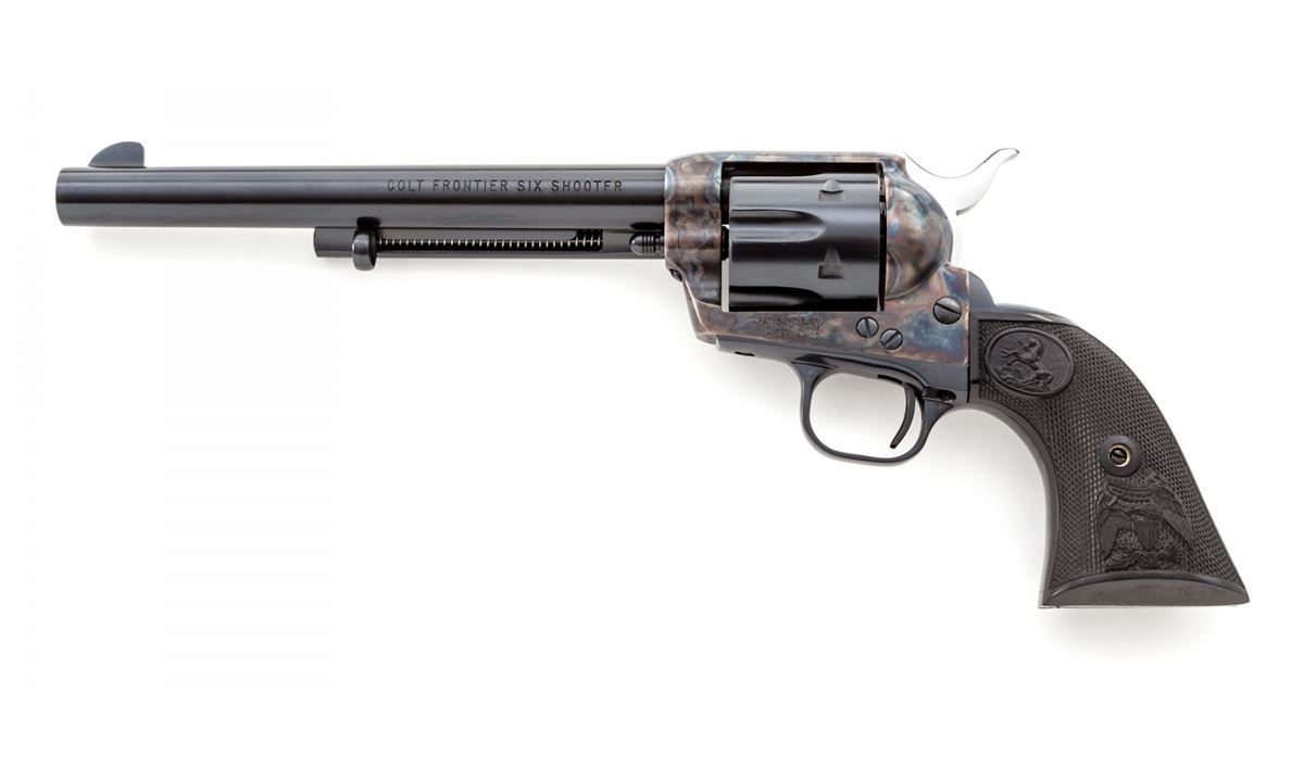 3rd Generation Colt Frontier Six-Shooter Single Action Army Revolver, #SA66802, .44-40 cal., 7-1/2'' barrel, blue and case hardened finish, with American eagle black plastic checkered grips. Condition is excellent showing only the lightest marks from handling. In original box with instructions. Exterior of box with some tatters. Est.: $1,000-$1,500. (C&R)