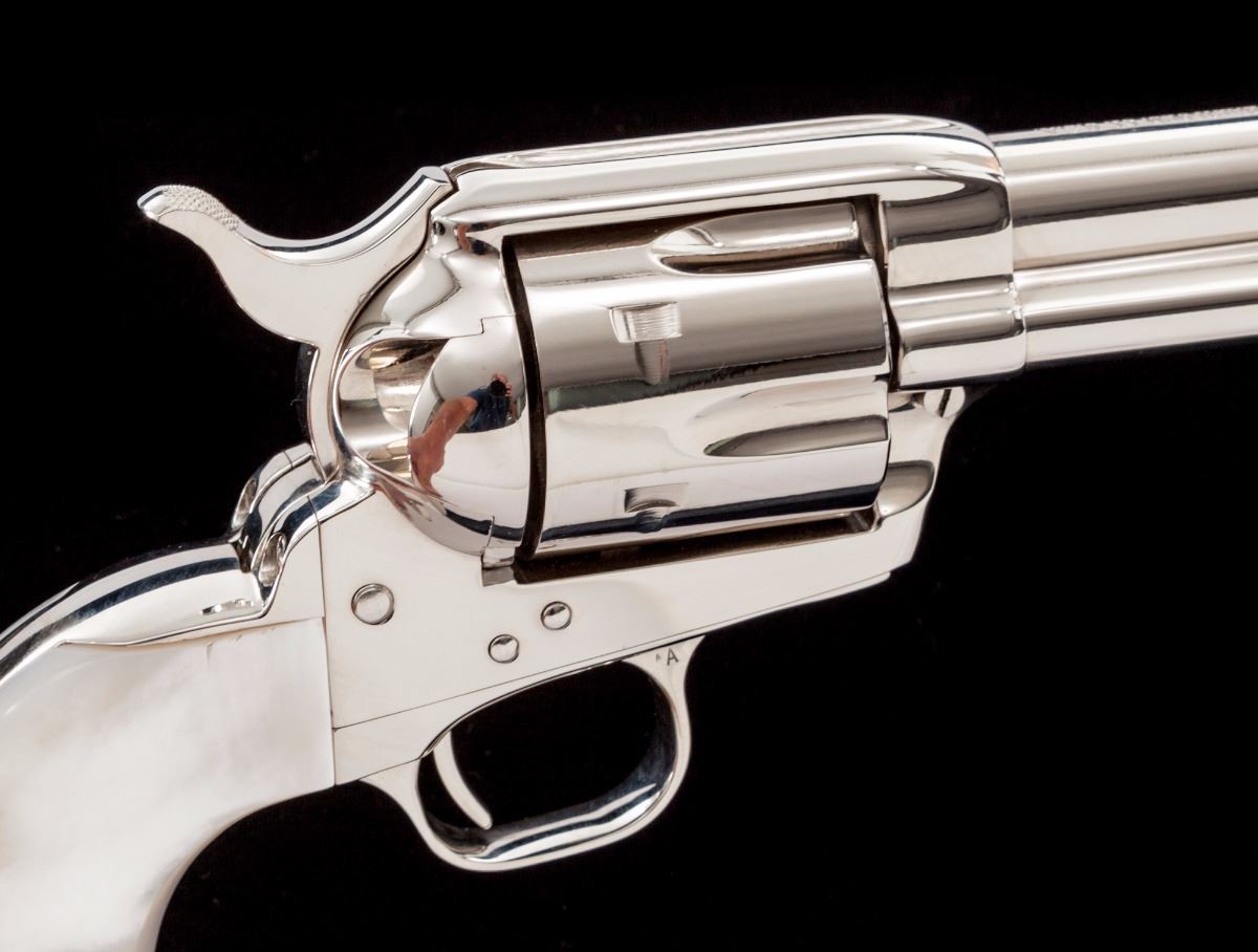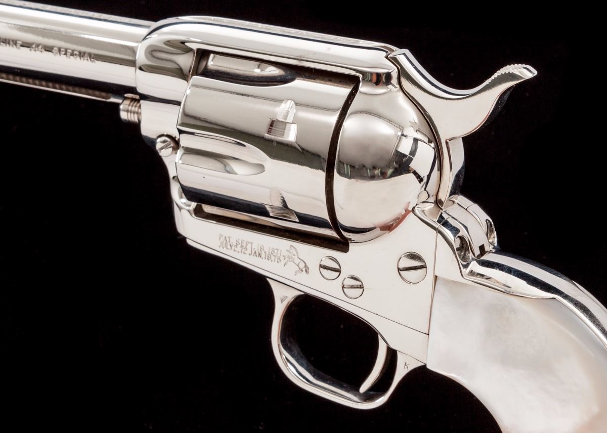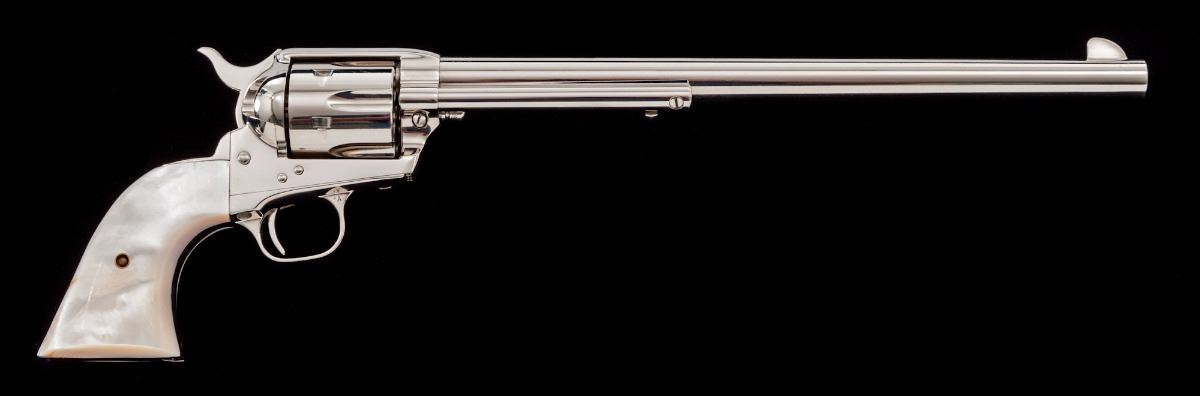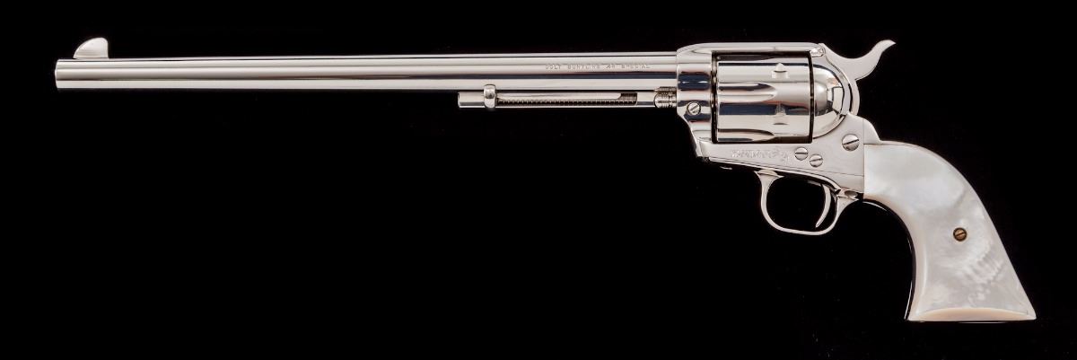 Colt 3rd Generation Single Action Buntline Revolver, #SA53287, .44 Spec. cal., 12'' barrel, nickel finish, pearl grips. Shipped to Pacific Int'l Merchandising Corp., Sacramento, CA, on July 18, 1982, in a two-gun shipment, with factory letter verifying all features, except grips, which are not listed. No doubt scarce both in nickel and this chambering. Condition is excellent showing very light micro-scratching to flat sides of frame and small areas of cylinder. Pearl grips are excellent, action is crisp, bore is bright. Est.: $1,800-$2,400. (Modern/PPT)