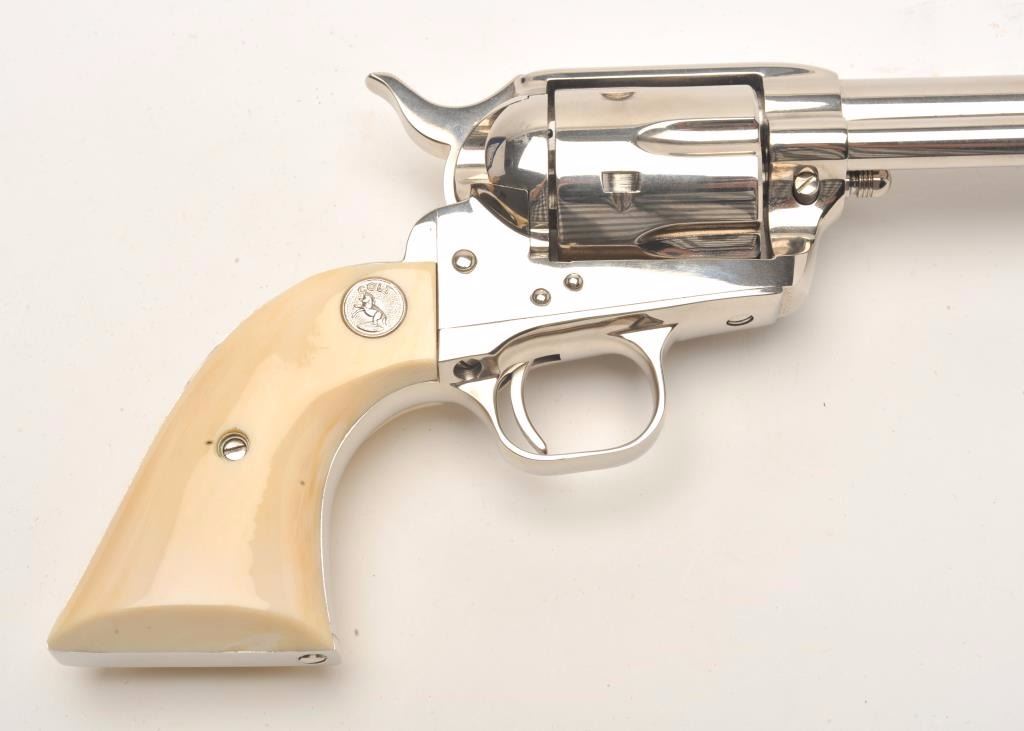 Colt 3rd Generation SAA Armoury Model revolver, .45 ACP caliber, 4.75” barrel, factory nickel finish, no grips, S/N SA66288, in like new condition. At time of description, grips missing as noted however,estate indicates they may be able to locate the grips, a case and an extra cylinder by time of auction. (Modern). Est.: $2,000-$4,000.