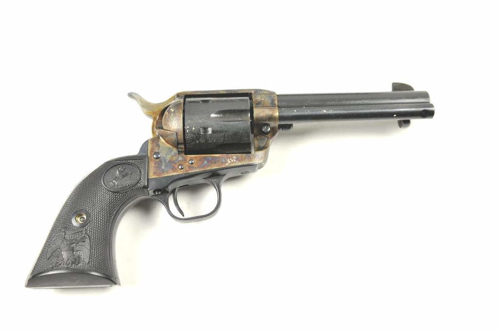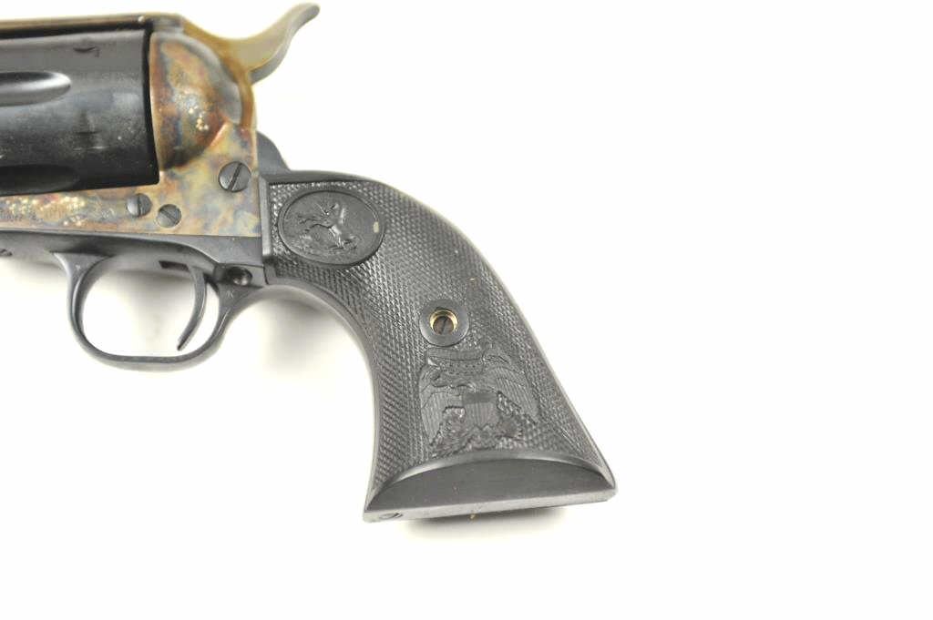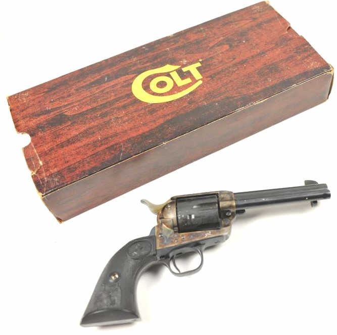 Colt 3rd Generation SAA Revolver in .44 Special caliber with a 4 ¾” barrel, blue and case colored finish, and hard rubber eagle grips, S/N SA48945. Excellent to near mint in original box with factory grease, papers and warning tag. The end flap has been torn and minor tatters to the box. The pistol is 99%+ to almost new with no index line or evidence of firing. (Modern/PPT) Est.: $1000-$2000
