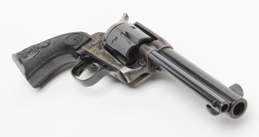 Colt 3rd Generation SAA revolver, .45 cal., 4-3/4” barrel, blue and case hardened finish, checkered hard rubber eagle grips, #S37876A (consecutive to previous lot), in factory blue two-piece box with factory white cardboard exterior slipcover boxincluding end label numbered to this gun. Revolver is in like new condition showing little handling; beautiful blue and case colors. (C&R/PPT). Est.: $1,400-$2,800.