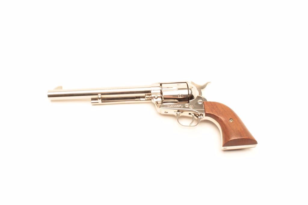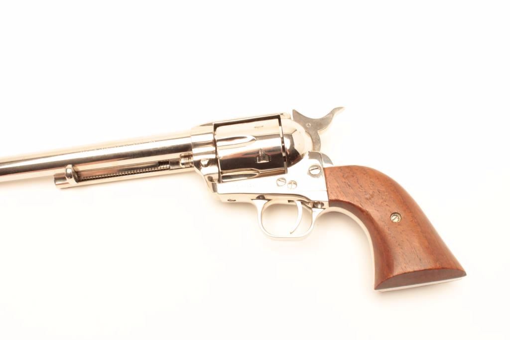 Colt 3rd Generation SAA revolver, .45 caliber, 7.5” barrel, factory nickel finish, smooth wood grips, S/N SA49821, in like new condition showing little handling. A really crisp Colt! (Modern). Est.:$1,250-$2,500.