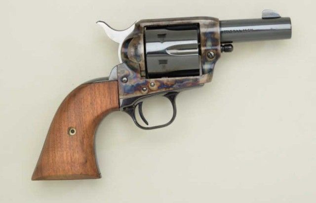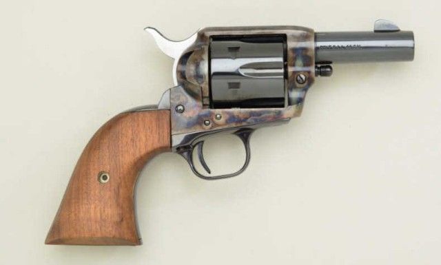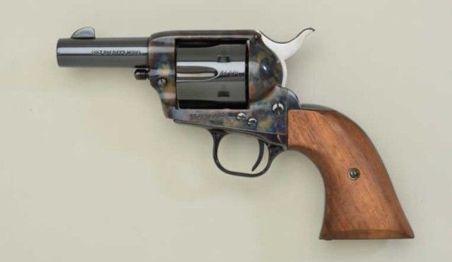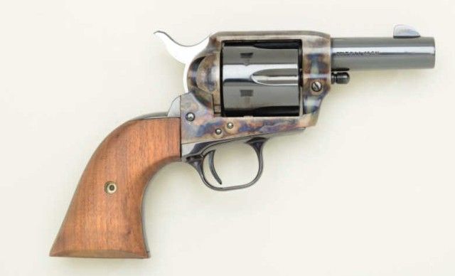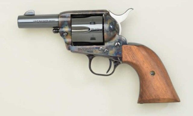 Colt 3rd Generation Sheriff’s Model SAA revolver, .44 Special cal., 3” barrel, blue and case hardened finish, smooth wood grips, extra .44-40 caliber cylinder in factory wood grained cardboard box with inserts andinstructions manual, #SA41097.This gun is in overall like new condition; box shows end label numbered to this gun and is in overall good condition with some general wear and tear and scuffs from storage. Est.:$800-$1,600.