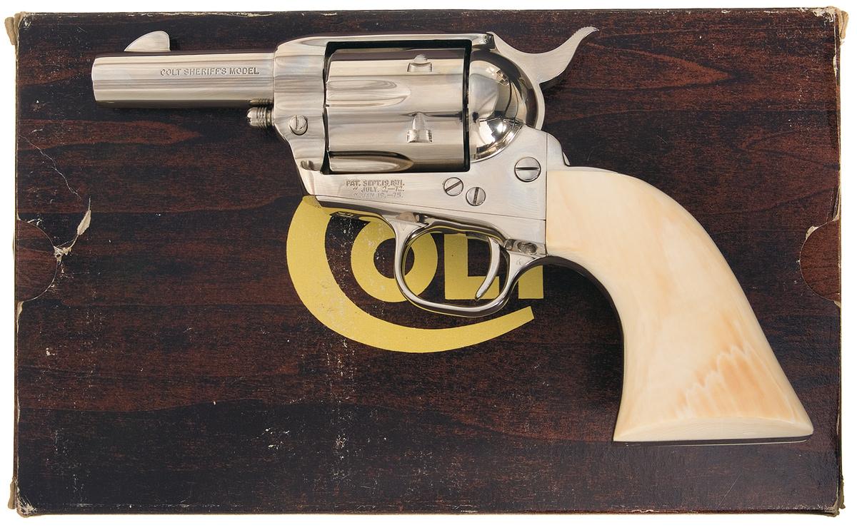Standard short two line address on top of the barrel, "COLT SHERIFFS MODEL" on the left side, "COLT S.A.A. .44 CAL" on the right side, and the three line, three patent dates on the left side of the frame. Matching serial number on the bottom of the frame and left side of the front and backstrap under the grip fitted with smooth two piece ivory grips numbered to the gun. Complete with the original "wood grain" box with Colt Custom Gun Shop end label numbered to the gun.