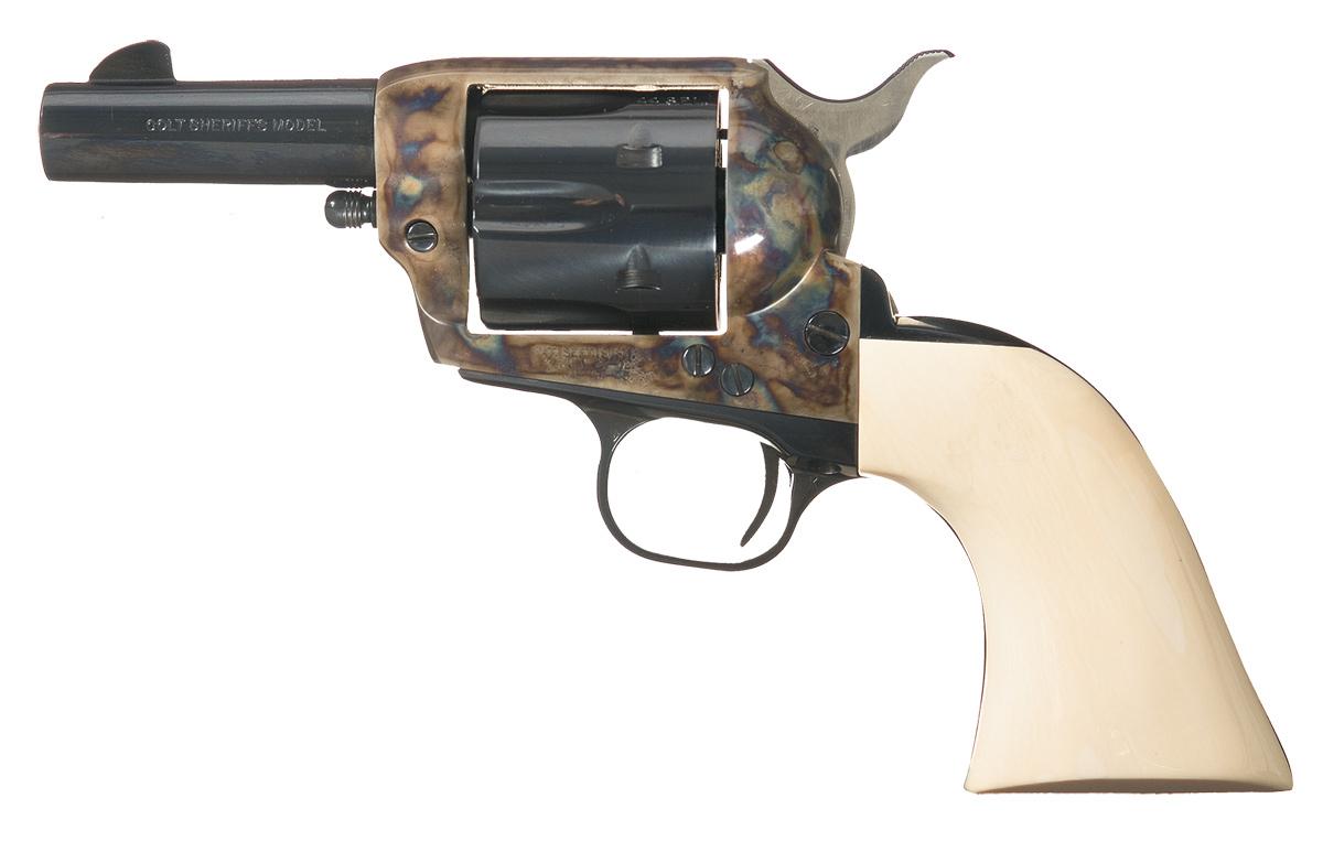Standard short two line address on top of the barrel, "COLT SHERIFFS MODEL" on the left side, "COLT SAA .44 CAL" on the right side, three line, three patent dates on the left side of the frame and "44 SPL." on the cylinder. Matching serial number on the bottom of the frame and left side of the front and backstrap under the grip. The grip panels are numbered to the gun. Casehardened frame, blue remaining parts and fitted with two piece smooth ivory grips. Complete with an extra 44-40 cylinder numbered to the gun.