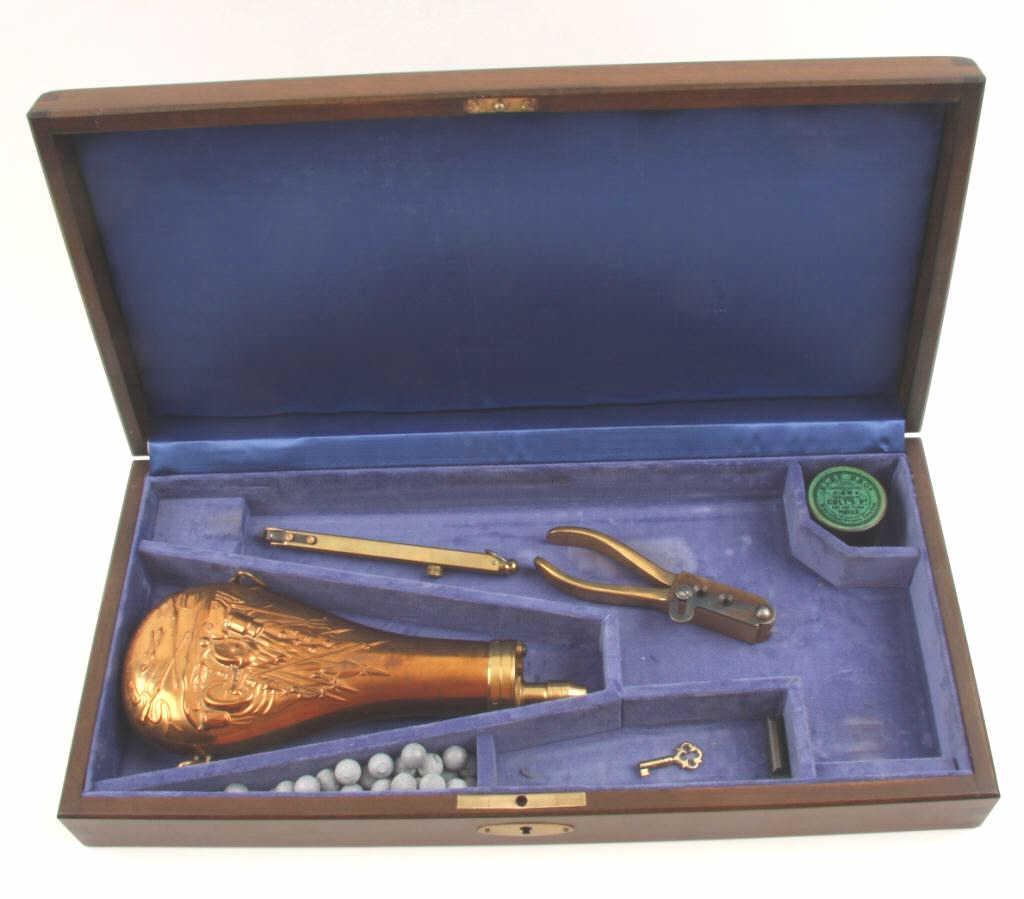 Colt 3rd Mdl Dragoon Cal .44 Percussion SN:30582, This new black powder series Dragoon has been long discontinued and this example is cased with a whole compliment of accessories. Fine to excellent condition, 98-99%+, no evidence of firing, just slight hSN:30582, This new black powder series Dragoon has been long discontinued and this example is cased with a whole compliment of accessories. Fine to excellent condition, 98-99%+, no evidence of firing, just slight handling and storage.Accessories include: flask, mold, nipple wrench, capper, cap tin, and key to box. An impressive set.