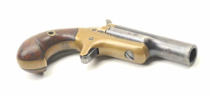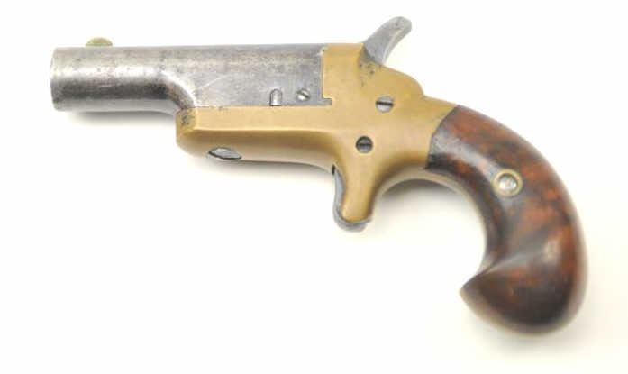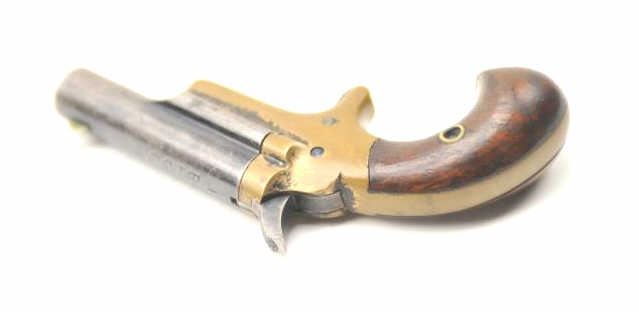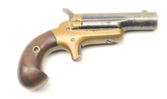Colt 3rd Model Derringer in .41 rimfire showing considerable original blue with early style curved grip, S/N 23207. 30%-50% original blue with deep patina on frame that is uncleaned. The grips are very good. Casecolors on hammer and blue on the trigger. Minor strike mark on the edge from closing with hammer down. Good action and good bore with minor erosion. Some minor pinprick pitting on the left but brilliant blue on the right side. (Antique) Est.: $275-$550