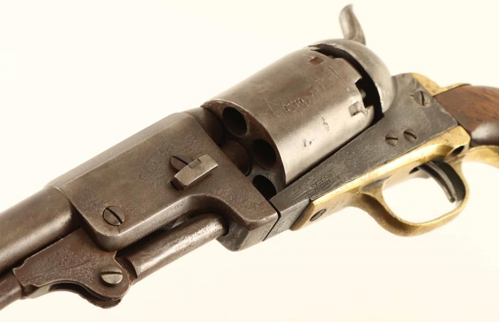 Antique American made single action percussion revolver chambered for .44 caliber ammunition, manufactured circa 1855. The Third Model Dragoon was the final design of the Dragoon series and was the end of the Colt "four pounder" revolver era. This revolver features a 7 1/2" part octagon barrel, German silver blade front sight, no rear sight as the tip of the hammer that would typically have the notch has sheard-off, loading lever with vertical style latch, non-fluted six-shot cylinder with rectangular stops & no observed scene, smooth trigger, roller bearing hammer with repaired knurled spur, brass backstrap & round trigger guard, and one-piece smooth walnut grip. The barrel is stamped "ADRESS SAMl COLT NEW-YORK CITY" on the top reading towards the cylinder and the frame reads "COLTS/PATENT". The serial number 15211 is found on the barrel lug, frame, triggerguard, backstrap & cylinder, while the the partial number 5211 is found on the barrel wedge & cylinder pin. Revolver exhibits a mostly aged brown patina with some mottled grey patina mixed in and also has a small amount of scattered pin prick pitting. The action is in good working order, the bore is dark with good rifling & scattered pitting, markings are good and the wood grip is good to very good with wear. Condition is NRA Very Good. ***Antique Firearm***