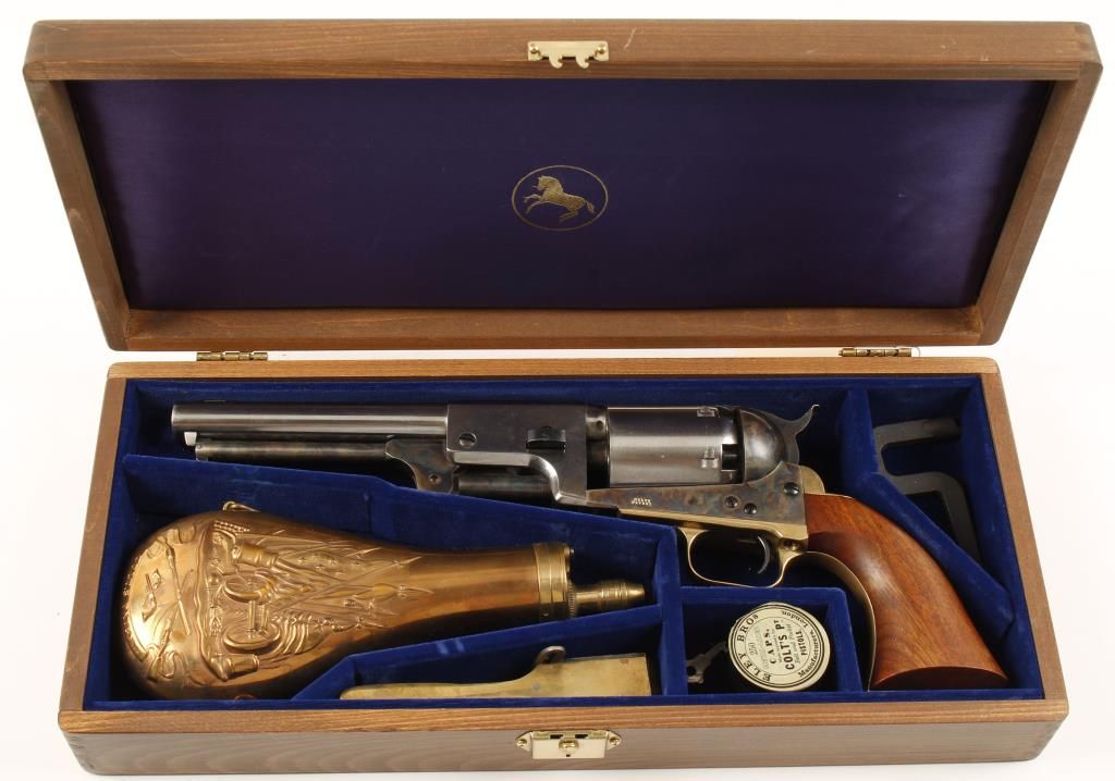 Second generation commemorative black powder single action 6-shot percussion pistol. Commemorating Giuseppe Garibaldi. One of approx. 206 and possibly one of only 94 as this has no etching or engraving. 7-1/2" in-the-white barrel. Case colored loading lever, frame, hammer and trigger. In-the white plain cylinder. Brass trigger guard and backstrap. Not cut for a shoulder stock. Lined hardwood case with loading and maintenance tools. Condition is excellent. *Antique Firearm*