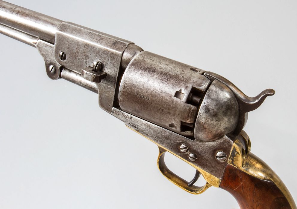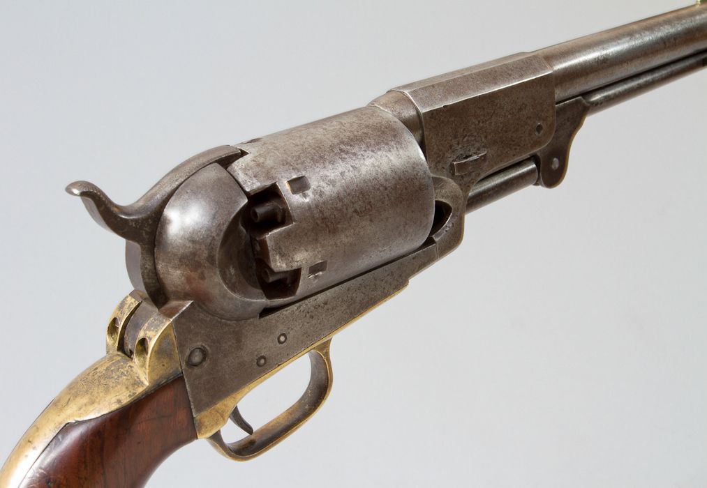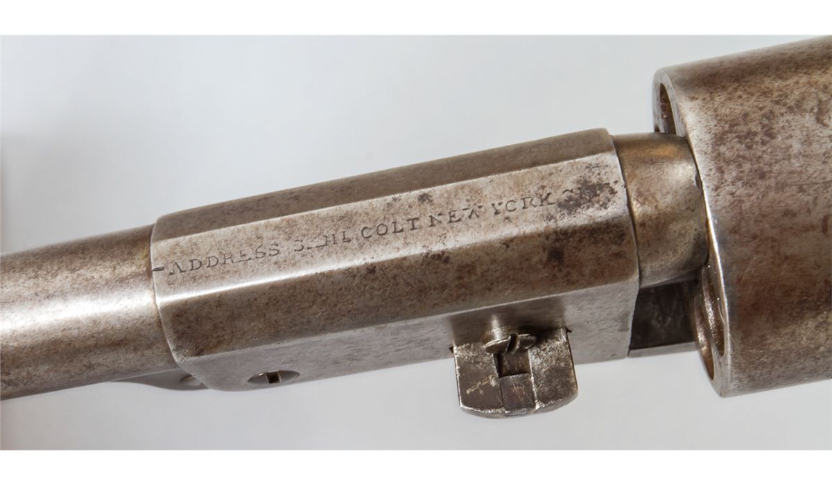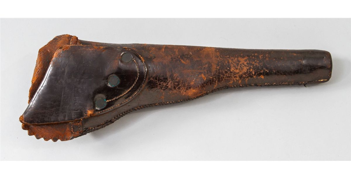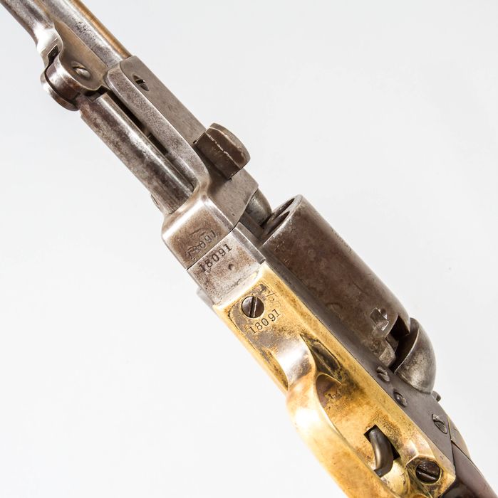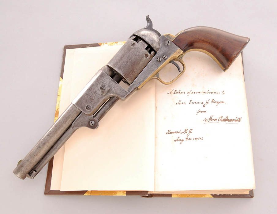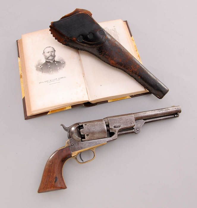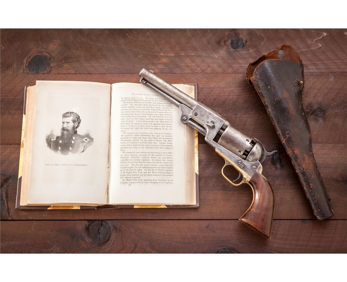 Colt 3rd Model Dragoon and Holster, belonging to Richard Corey Vinson of the 8th Cavalry Regiment, Illinois Volunteers, #18091, .44 cal., 7-1/2'' barrel, blue and case hardened finish, smooth walnut grips, silver-plated backstrap and triggerguard, all matching visible serial numbers including wedge, and originally mfg'd in 1859, along with a pre-Civil War U.S. Arsenal holster. This pistol, by family tradition, was obtained from a captured Confederate officer by Cpl. Richard Corey Vinson of the 8th Illinois Volunteer Cavalry, who brought the gun home when he was on leave. Cpt. Vinson fought in the Battle of Gettysburg, was mortally wounded on July 6, 1863, and died the following day, buried at Antietam National Cemetery. The signed afidavit furth states that this revolver was at one time in the possession of Cpt. Vinson's great-nephew, who remembers it being around the house since he was a small boy in the 1930s. Included with this item is its original holster, now missing flap, a brief family history where Vinson is mentioned as having been killed in action with the Union Army in the Civil War, photos from the Gettysburg National Battlefield and the Antietam National Cemetery, as well as a rebound copy of ''The History of the 8th Cavalry Regiment, Illinois Volunteers During the Great Rebellion'', printed in Aurora, IL., in 1868, where he is mentioned in several places. Condition is good to very good retaining little original finish, with most of the iron parts having gone a silvery gray. Silver plating to triggerguard shows traces in protected area and near serial number. Action is good, bore is fair. An interesting Dragoon with great Civil War history. Est.: $12,000-$18,000. (Antique)