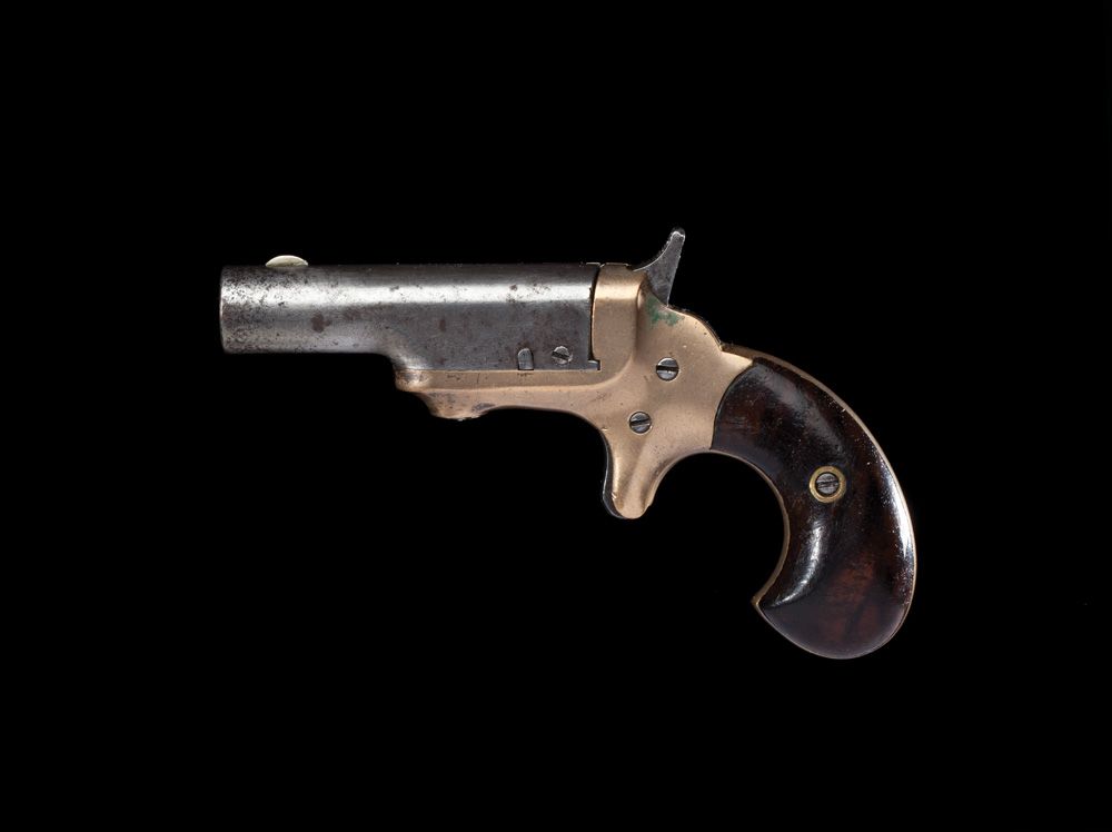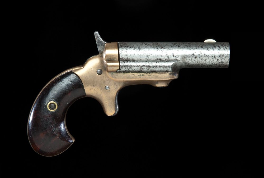 Early style with raised area around barrel screw and tiny Colt stamping. High hammer, finely pitted bore, gray iron barrel, smooth mustard colored frame with touches of silver remaining, and some blue on hammer, trigger and barrel screw. Smooth walnut grips.