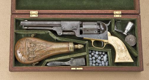 Colt 3rd model Dragoon with rare 8” barrel, brown patina finish, raised carved ivory grips showing American eagle, in associated case with accessories. Serial #18700. The pistol remains in good original conditionshowing a light grey to brown patina finish, good markings, some light to moderate scattered pitting and erosion and a couple of areas of slightly heavier pitting that are small and mostly on the front edge of thecylinder and lug of barrel. All matching serial numbers, wedge unnumbered but correct type. Bore is surprisingly bright and very good. There has been a repair to the arbor and forcing cone at the breech has beensurfaced slightly. The loading lever latch is a well made replacement and the grips, which are old and nicely carved, are later. The gun is generally good overall and is an acceptable specimen of a rare Dragoon ofwhich only 100 to 200 are estimated to have been produced. The case is a well made older association which shows a green velveteen lining in the partition style which is proportioned correctly and made well and