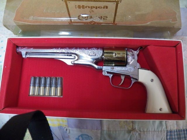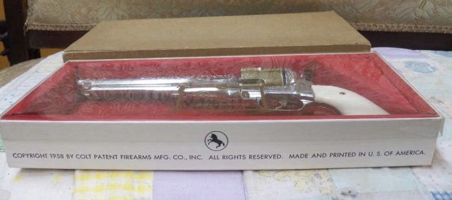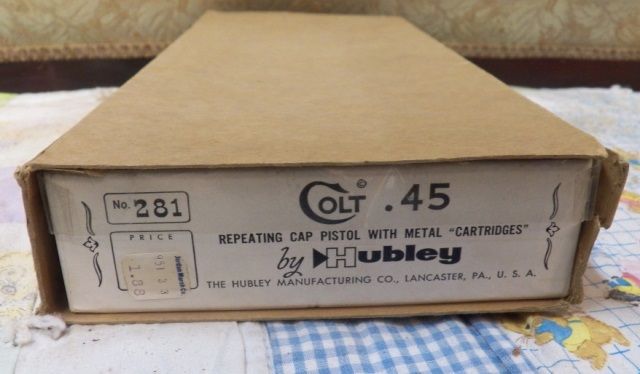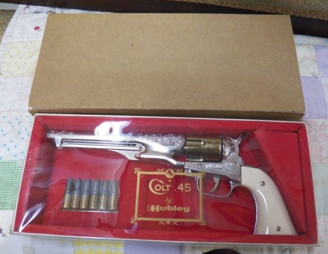 Hubley Colt 45 Mint in Box, This gun comes in it original box with plastic cover & cardboard sleeve it was shipped in. box is complete with bullets. Never played with never fired. You will never find another with