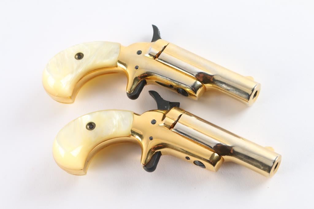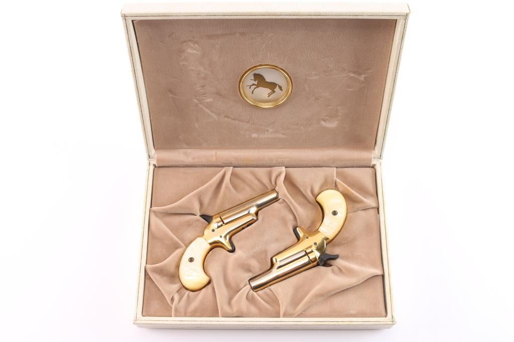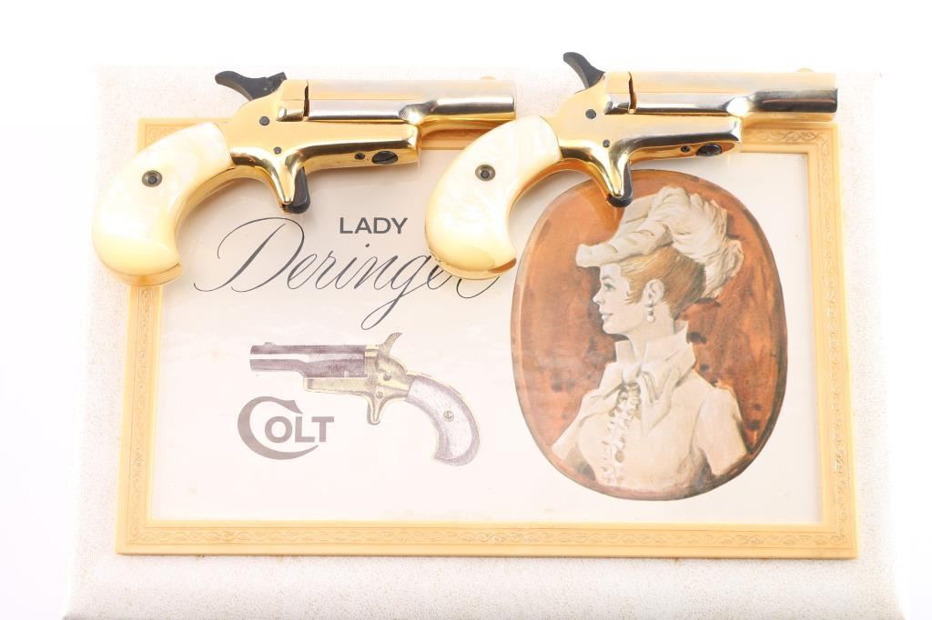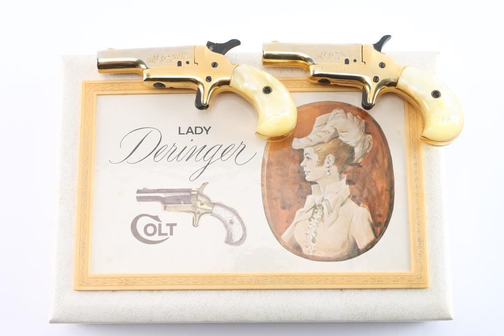 .22 Short SN's 25069DER, 25070DER. Manufactured 1970-73. Vintage cased set of single-shot side opening .22 short derringers with 2-7/16" barrels in a cream colored velvet lined white jewelry style box. gold toned with simulated Mother of Pearl grips. The finish on both of these guns is approximately 80-90% showing edge wear. Actions work well. Bores are bright, good rifling with some scattered very light areas of pitting, and grips are excellent. The box lid says "Lady Deringer Colt" and the interior of the lid has the rampant Colt symbol. Box is excellent.