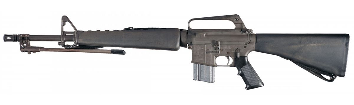 Manufactured from 1986 to 1991. M16A1 style upper receiver with heavy barrel adjustable post front and two position peep rear sights. Birdcage flash hider, bayonet lug and aftermarket bi- pod. Standard lower receiver markings. Synthetic smooth triangular forearm, checkered pistol grip and smooth buttstock with buttstock storage containing a four piece cleaning rod, bore brush and chamber brush. Complete with nylon web sling.