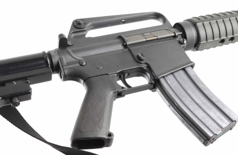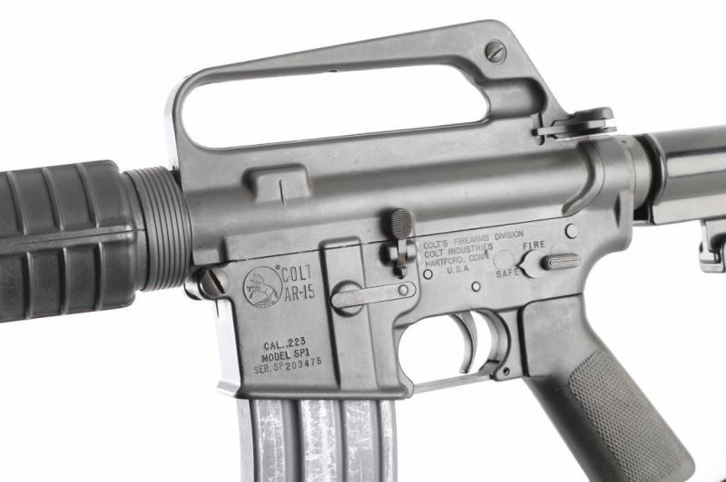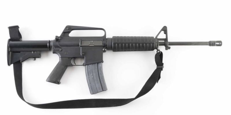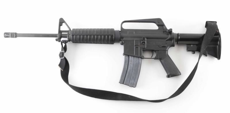 'R6001' Semiautomatic rifle features parkerized finish, black plastic furniture, two position collapsing stock with slot for sling, round carbine hand guards, 16" lightweight barrel, 6 flute flash suppressor, bayonet lug, adjustable sights (front post sight with protector ears, rear L-flip peep), early "slick side" A1 type upper receiver without forward assist, spring loaded ejection port cover, early style lower receiver without fence around magazine release, dual screw style front take down pin, manual safety, sling swivel on front sight base. Barrel appears earlier 1-12 twist, hard chrome lined, marked "C MP CHROME BORE". Bore is very good condition. Overall external appearance is very good with blemishes, retains 90% finish, with scratches & rub marks mostly on barrel, some bare metal showing on edges. Plastic furniture is very good condition with scuffs and other minor blemishes. Includes (1) 30 rd magazine, black nylon sling. Condition is NRA Very Good++ *** Modern Firearm ***