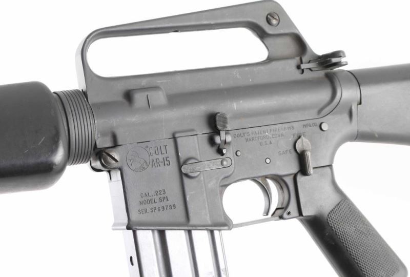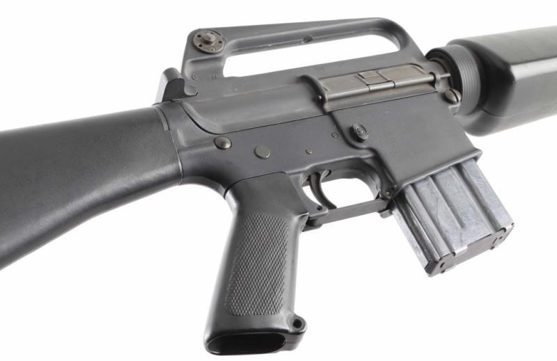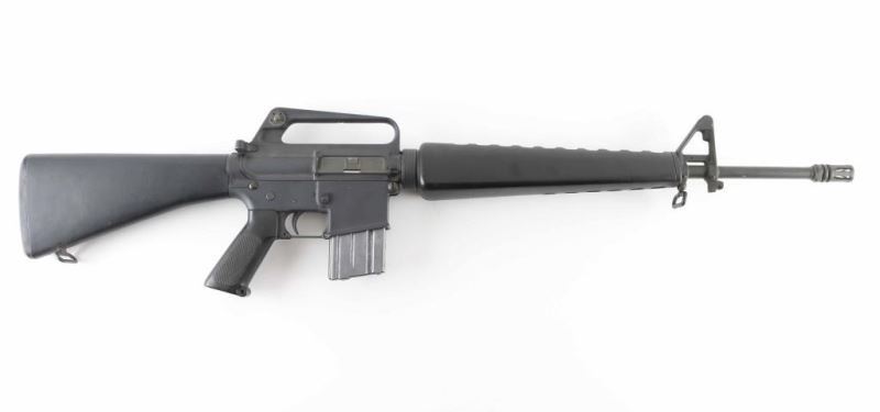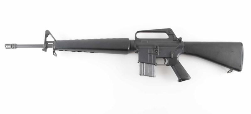 'R6000' Semiautomatic rifle features parkerized finish, black plastic furniture, A1 length fixed stock with butt storage compartment, triangular cross section hand guards, 20" lightweight barrel, 6 flute flash suppressor, bayonet lug, adjustable sights (front post sight with protector ears, rear L-flip peep), early "slick side" A1 type upper receiver without forward assist, spring loaded ejection port cover, early style lower receiver without fence around magazine release, dual screw style front take down pin, manual safety, sling swivels. Barrel appears earlier 1-12 twist, hard chrome lined, marked "C MP CHROME BORE". Bore is very good condition. Overall external appearance is very good or better, retains 90% finish, with scratches & rub marks, bare metal showing on edges. Plastic furniture is very good condition with scuffs and other minor blemishes. Includes (1) 20 rd magazine. Condition is NRA Very Good+ *** Modern Firearm ***