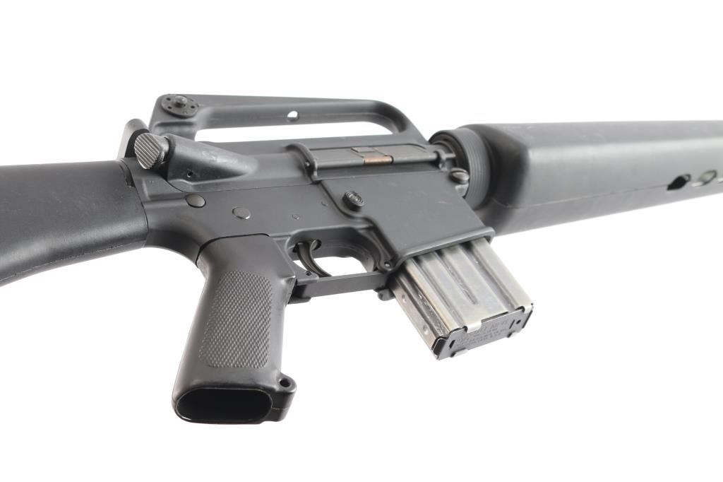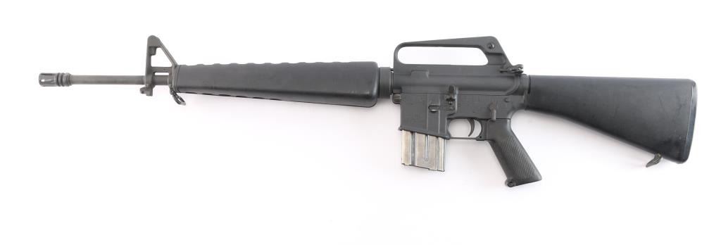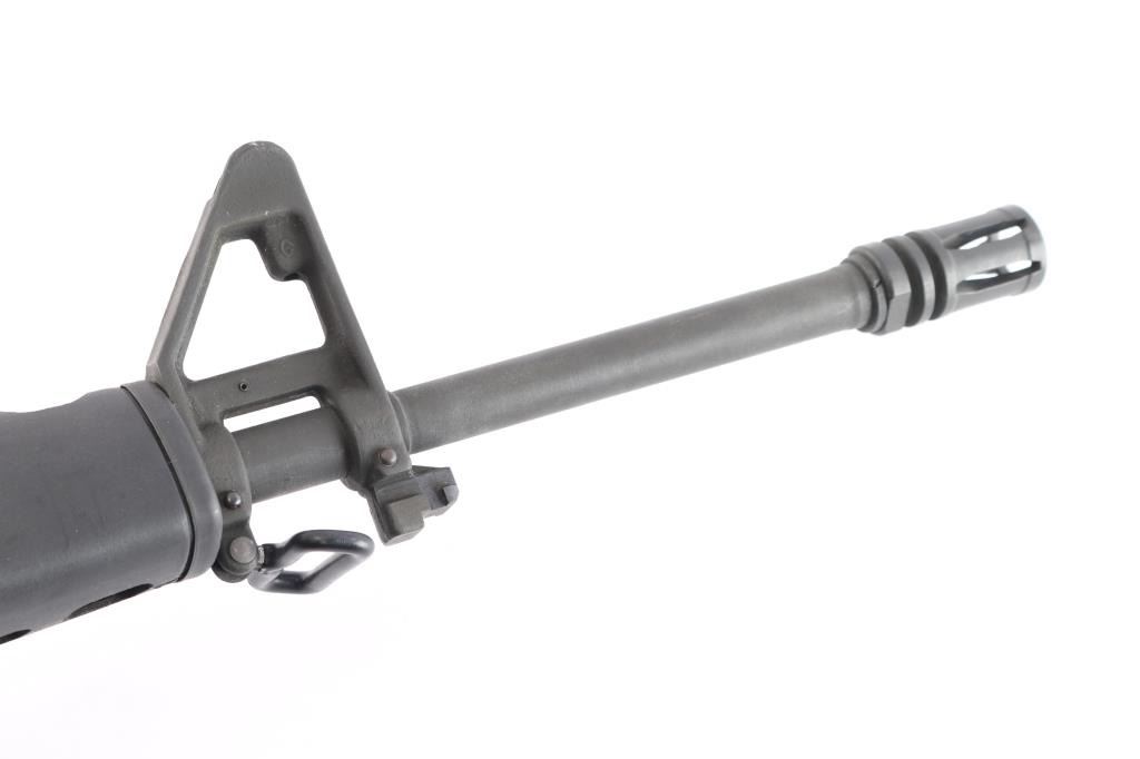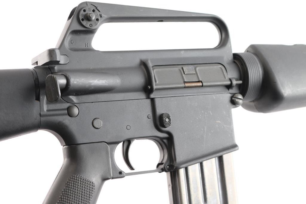 'R6000' Semiautomatic rifle manufactured circa 1980s. Features a matte gray finish, black polymer furniture, A1 pistol grip, early A1 length fixed stock with butt storage compartment and GI cleaning kit, triangular cross section hand guards, 20" lightweight barrel, A1 flash suppressor, bayonet lug, adjustable sights (front post sight with protector ears, rear L-flip peep), carry handle upper receiver with forward assist. Both upper and lower receivers are very close in finish and are a tight fit. Spring loaded ejection port cover, early style lower receiver without fence around magazine release, dual screw style front take-down pin, manual safety, sling swivels. Barrel appears earlier 1-12 twist, hard chrome lined, marked "C MP CHROME BORE". Bore is excellent condition. Overall external appearance is near excellent, retaining approx. 95% finish with scuffs and minor edge losses. Polymer is very good with light scuffs. Close to new appearance with very little rubbing wear on bolt carrier. Includes one Colt 20 rd magazine. Condition is NRA Very Good+. ** Modern Firearm **