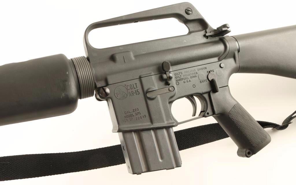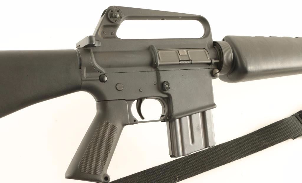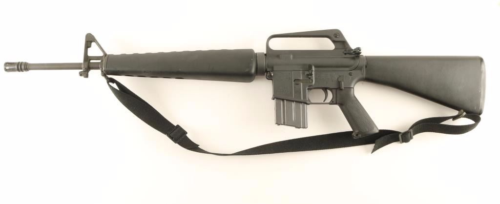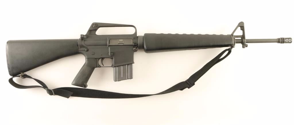 Gas-operated semi automatic sporting rifle chambered in .223 Remington, circa 1980. Features a 20" chrome-bore barrel with bird cage style flash hider, adjustable A2 winged front sight with bayonet lug, dual aperture rear sight in carrying handle, triangular hand guard, correct BCG, checkered black plastic pistol grip, 20 round factory magazine, safety selector, black nylon sling, and black composite shoulder stock with cleaning kit. Finish shows only light wear and few scuffs from handling & storage. Markings are crisp, and receiver shows minor dings in the metal under the finish. Action is sound, bore is very good, and stocks are fine. Condition is near excellent. ***Modern Firearm***