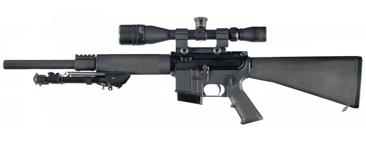 This is an assembled heavy barreled AR-15 Carbine that uses a Colt Match Target Match HBAR lower receiver with an unmarked flattop upper receiver using a blackened Olympic Arms Stainless Ultra Match 1/8 twist 5.56 barrel; marked "1x8" next to "SUM/556", a blackened knurled aluminum tube forearm and flattop gas block. Mounted on the flattop upper is a Tasco 4-16x40 mm scope with elevation target turret and adjustable objective. The stock and pistol grip are a synthetic polymer and there is a Harris bipod attached to the front sling swivel stud.