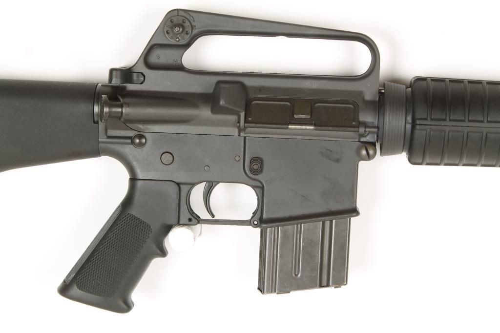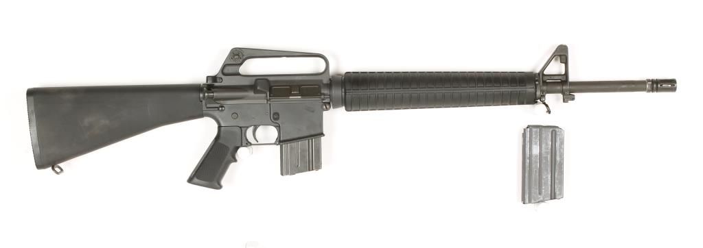 Pre ban semi auto AR-15 rifle with 20" barrel. Black finish, black plastic butt stock, checkered black plastic pistol grip, A2 front sight, aperture rear sight in carry handle, flash hider, bayonet lug and provisions for a sling. Good bore and action. Includes 2 magazines, 10 rounds each. Condition: Very good showing light use. *Modern Firearm*