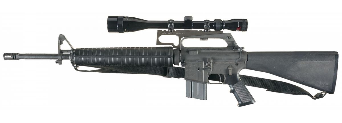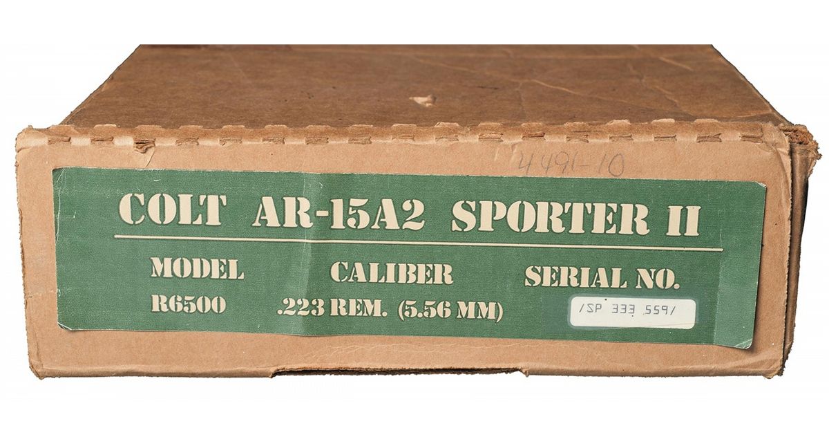 Elevation adjustable post and windage adjustable 2-leaf peep sights, with a Tasco 6-18x40 scope installed on a Federal Ordnance brand carrying handle rail. A bird cage flash hider and bayonet lug are installed on the 1/7 twist barrel, with a ribbed forearm, standard Colt markings on the magazine well, forward assist and a checkered buttplate. With an original "green label" Colt box numbered to match, a 20 round magazine, and sling.