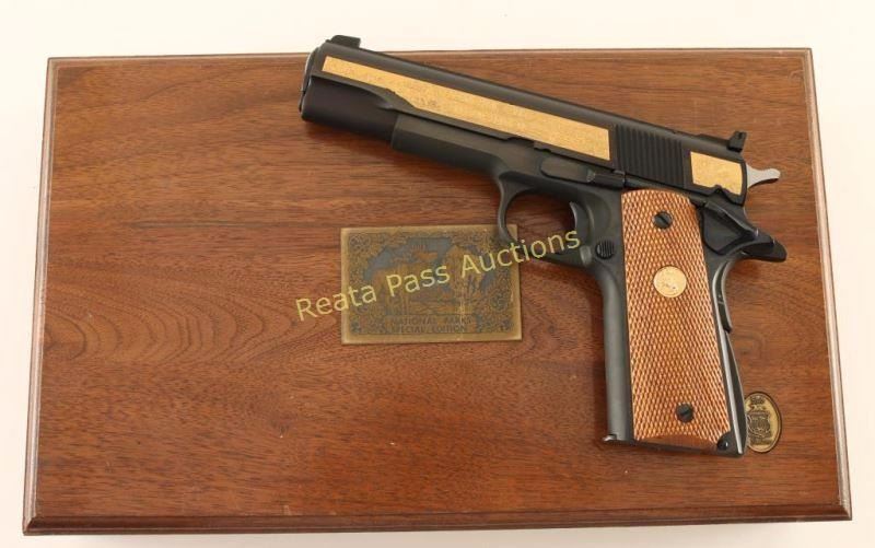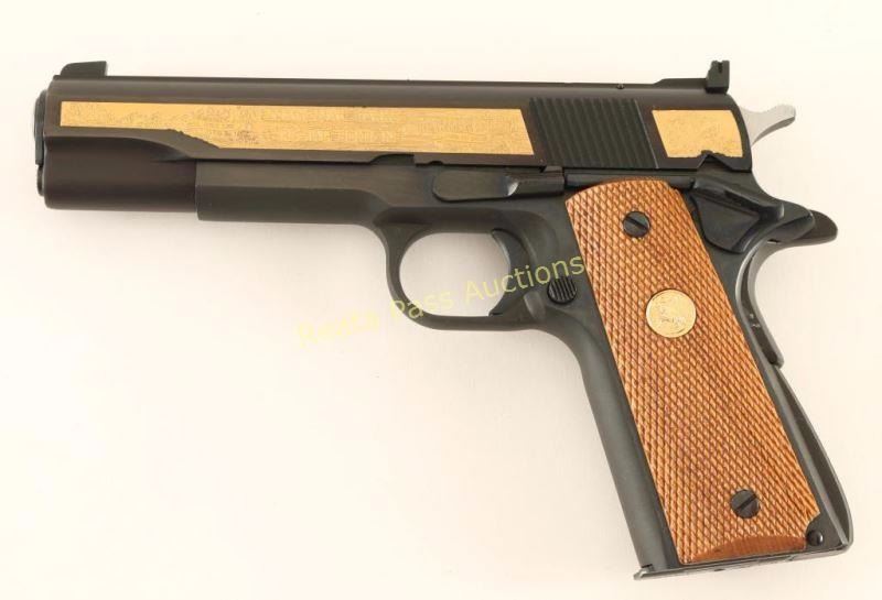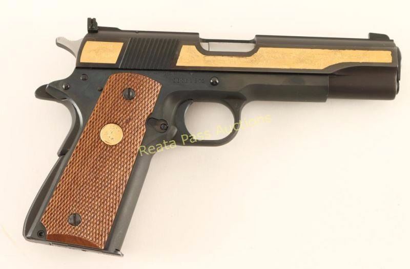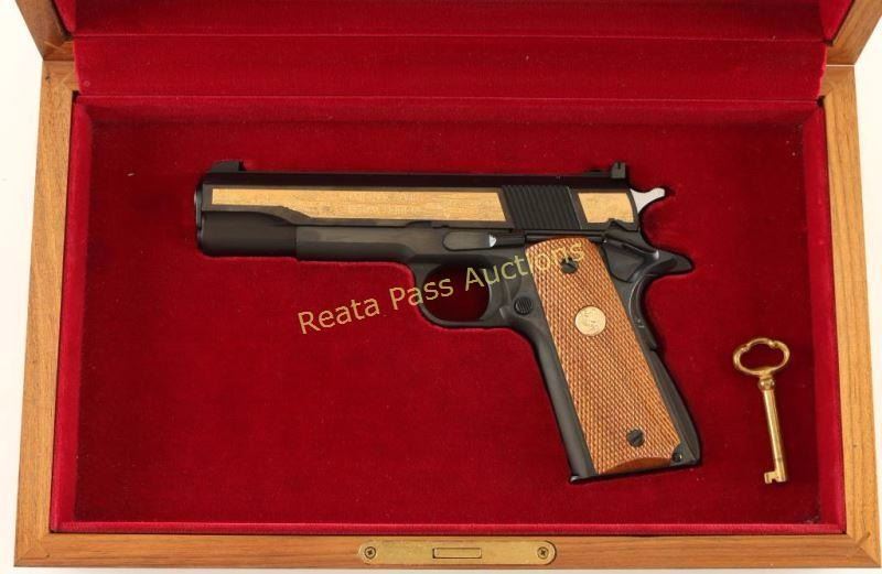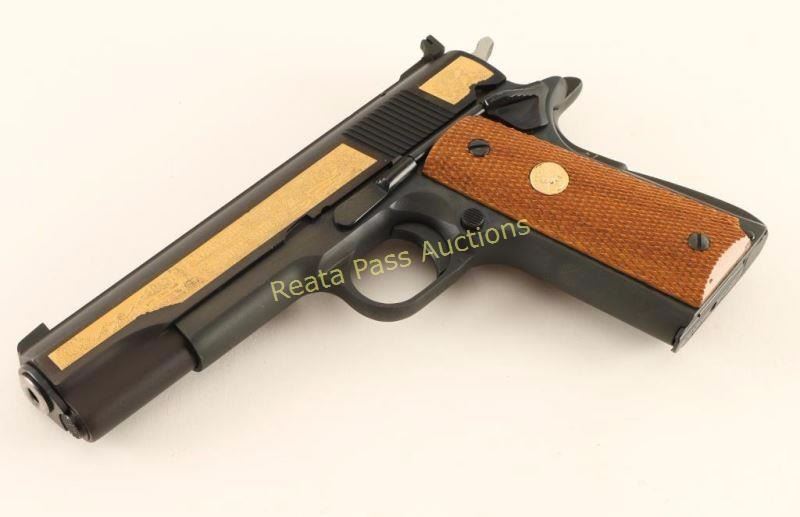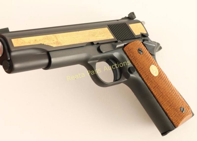 SN: 38081B70 Cased commemorative 1911-A1 style blowback-operated semi-automatic pistol chambered in .22 Long Rifle, circa 1980. 1 of only 200 produced. Features a high polish/matte blued finish, gold embellished slide with engraved Nation Park scenes, 5" heavy barrel, patridge front sight, adjustable rear window sight, serrated trigger, serrated hammer spur, thumb safety, beavertail grip safety, push button magazine release, 10 round factory magazine, serrated arched mainspring housing and two-piece checkered walnut grips with Colt medallions. Includes a factory French style fitted wood presentation case with velvet lined interior and photo-engraved brass plaque that reads "NATIONAL PARKS SPECIAL EDITION 1 OF 200". Pistol exhibits approximately 99% of it's original finish with only a couple light handling marks on the slide observed. Action is smooth, bore is excellent, and wood are fine. Condition is near new. ***Modern Firearm***