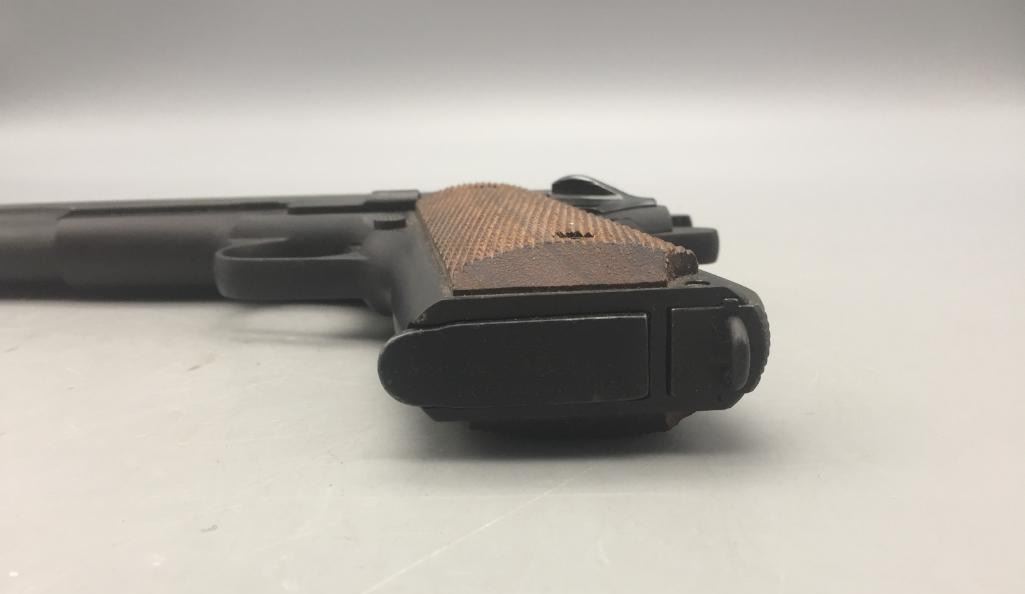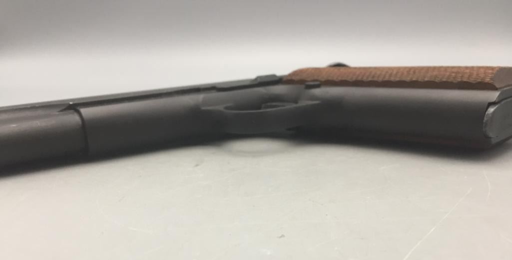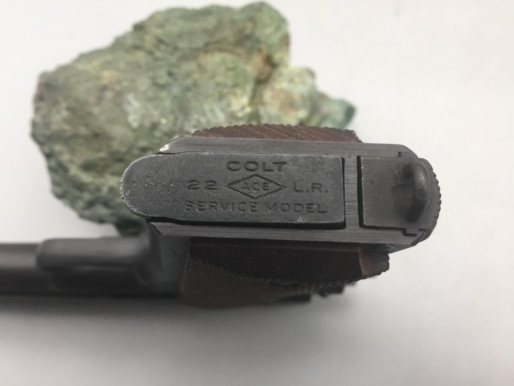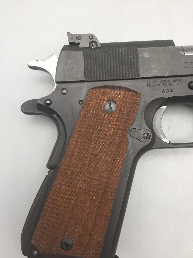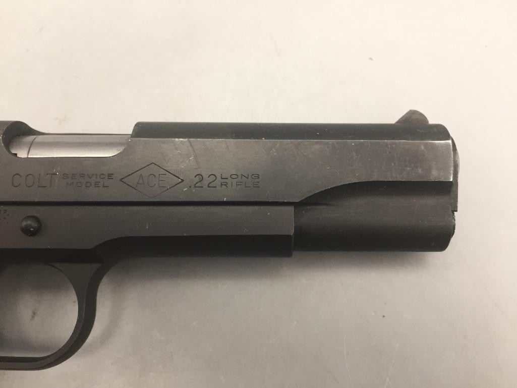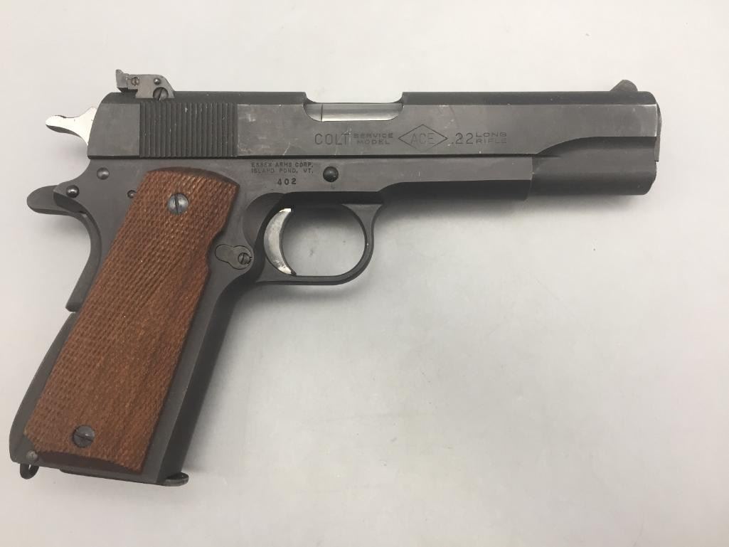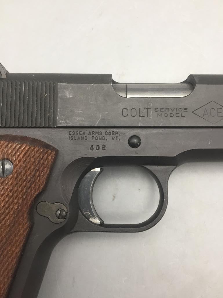 Offered for sale in this lot is a Colt service model, aka Colt Ace, .22 caliber long rifle, semi-auto pistol with box. While the Colt 1911 was chambered in the powerful .45 ACP cartridge, the externally similar Colt Ace was chambered for the far less powerful .22 LR cartridge. Accordingly, shooters could shoot the Ace without the recoil and expense of the 1911, but with a similar experience. It has a 5 inch barrel and is in nice condition. It is serial number 402 on an Essex arms frame. Maker: Colt / Essex Serial No. 402. Barrel measures 5". Age: Circa late 1970s. Please look closely at the pictures - they are an important part of our description. Shipping: There will be a $15 handling / packaging fee for shipping this lot. The actual cost of postage will be added on top of that. *****This firearm requires an FFL Transfer*****