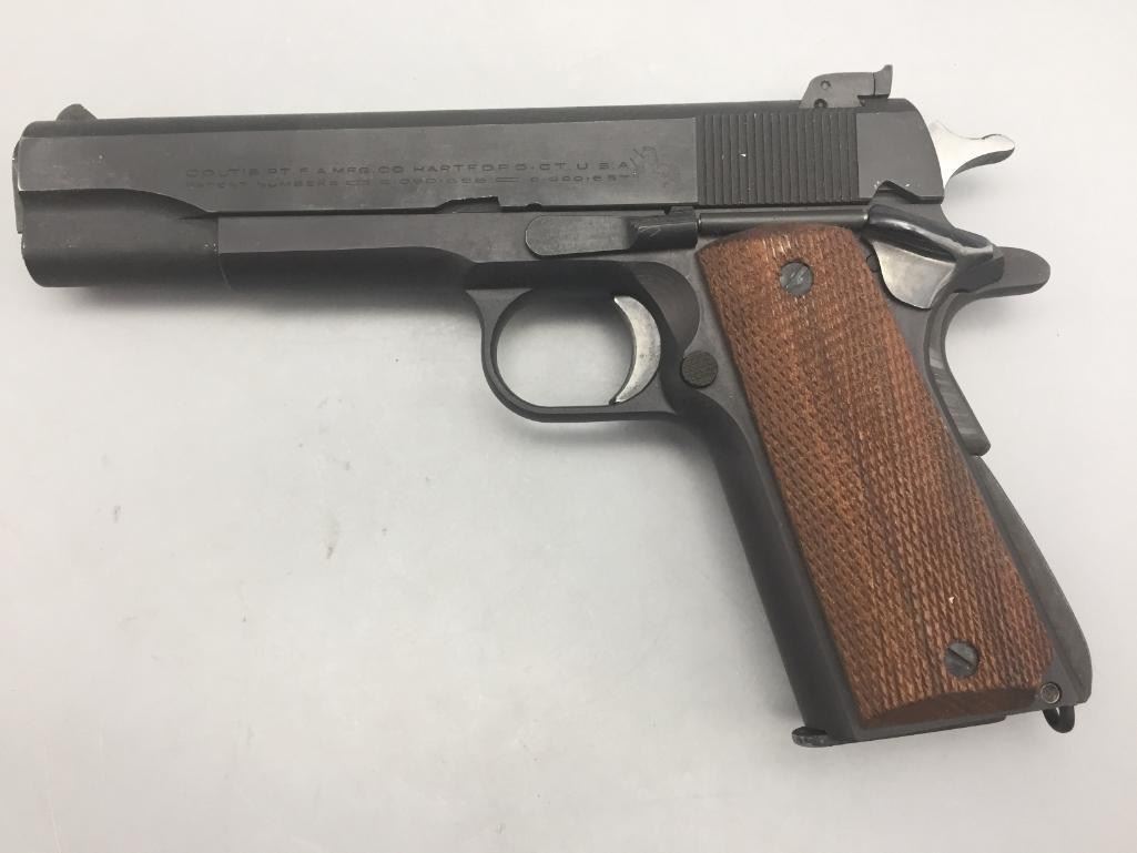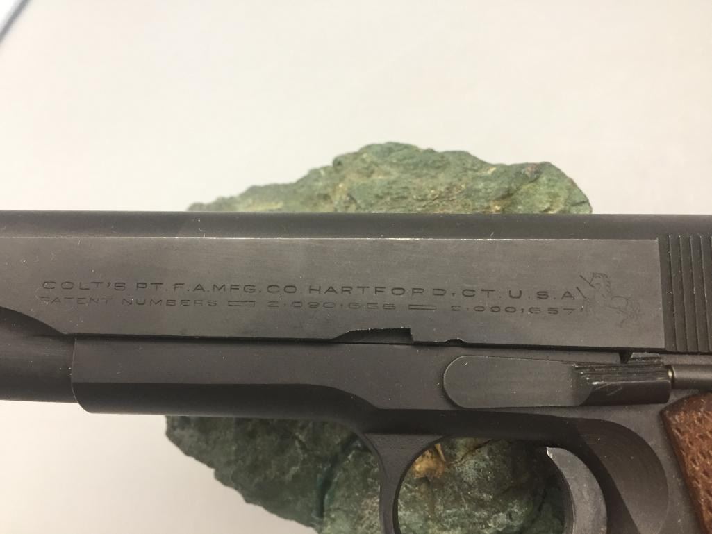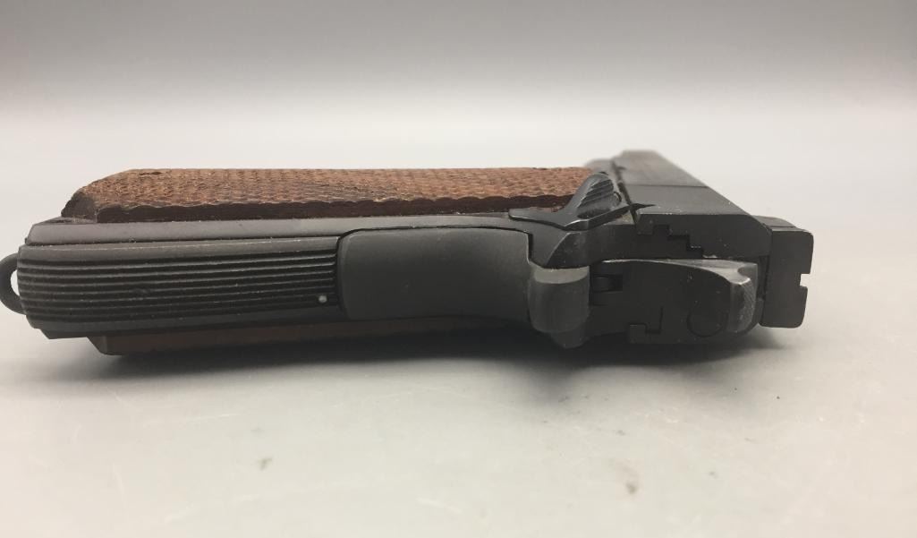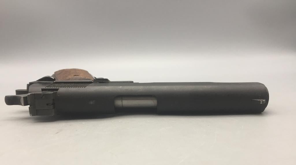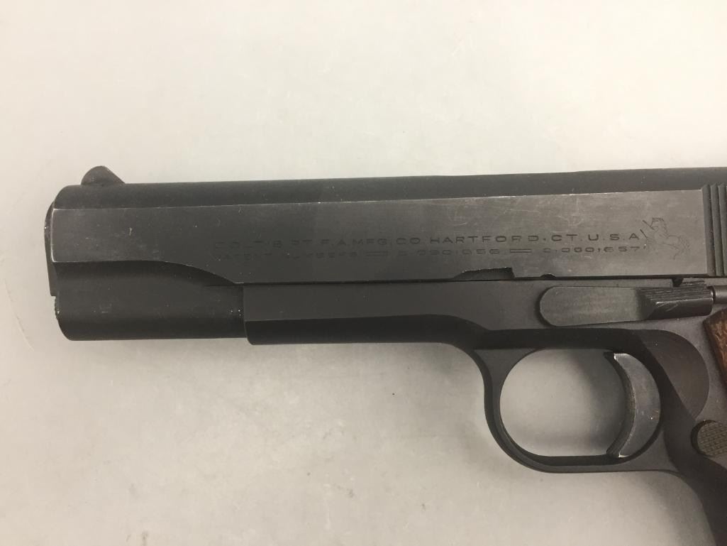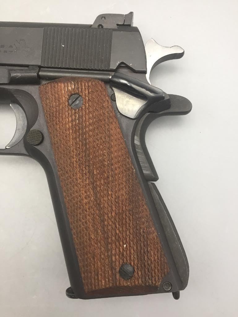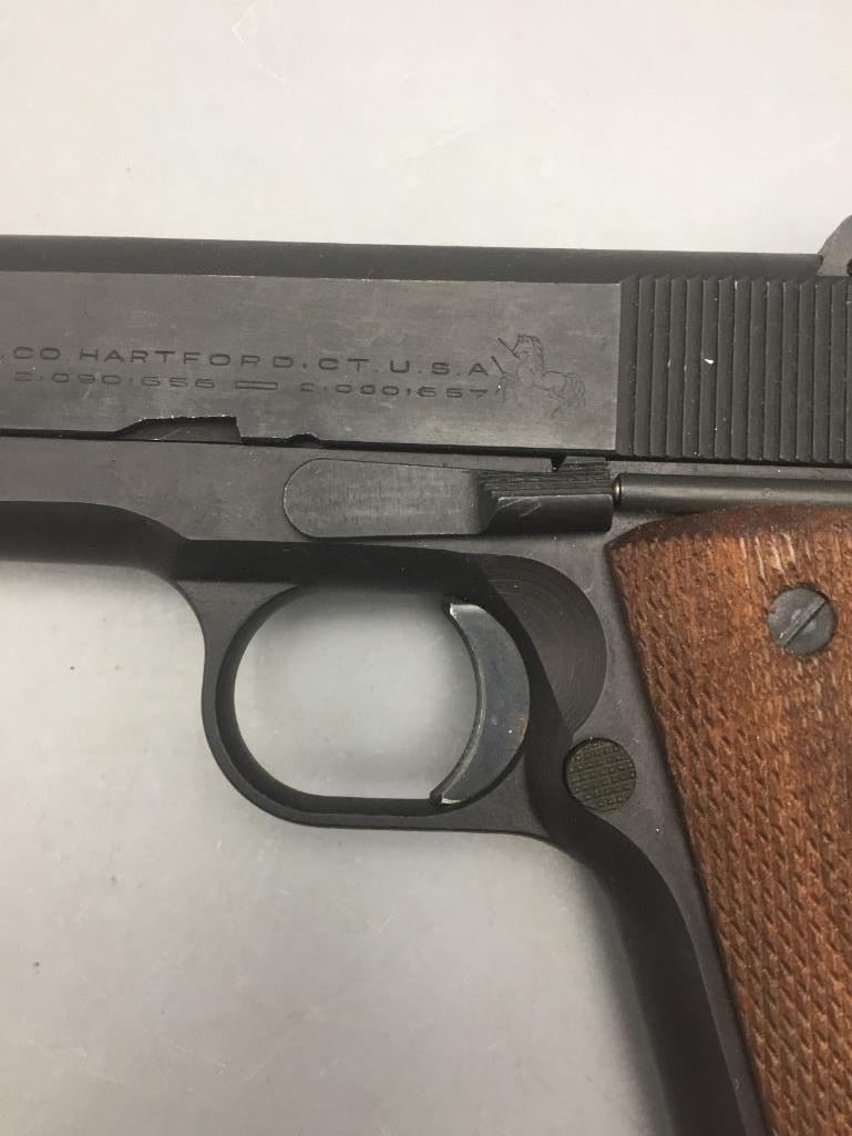 Offered for sale in this lot is a Colt service model, aka Colt Ace, .22 caliber long rifle, semi-auto pistol with box. While the Colt 1911 was chambered in the powerful .45 ACP cartridge, the externally similar Colt Ace was chambered for the far less powerful .22 LR cartridge. Accordingly, shooters could shoot the Ace without the recoil and expense of the 1911, but with a similar experience. It has a 5 inch barrel and is in nice condition. It is serial number 402 on an Essex arms frame. Maker: Colt / Essex Serial No. 402. Barrel measures 5". Age: Circa late 1970s. Please look closely at the pictures - they are an important part of our description. Shipping: There will be a $15 handling / packaging fee for shipping this lot. The actual cost of postage will be added on top of that. *****This firearm requires an FFL Transfer*****